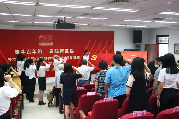在接下来的环节中,学院党委书记陈志伟向受到表彰的先进集体和优秀个人表示热烈的祝贺,向长期奋战在学院改革发展和立德树人一线的各党支部和党员干部表达衷心的感谢和节日的问候。她紧紧围绕习近平总书记近期重要讲话精神和我们党一百年的光辉历程,强调要深刻认识中国共产党的领导、中国特色社会主义道路是历史的选择、人民的选择,要不断增强继往开来走好新时代长征路的自觉性坚定性。她号召全体外文人胸怀两个大局,在危机中育新机、于变局中开新局,在新时代的长征路上留下属于自己的“奋进之笔”,为全面建成社会主义现代化强国、实现中华民族伟大复兴的中国梦而努力奋斗!最后,全体同志起身面对鲜红的党旗,在退休支部原党支部书记陈升法老师领誓下,新党员进行了入党宣誓,老党员重温了入党誓词。