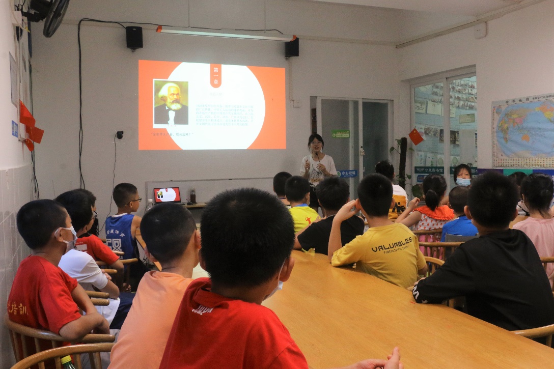 2021年7月6日,实践队第一天到达了后埔公益图书馆,宣告了夏令营教学活动的正式开始。第一天的教学内容为中国共产党的诞生,主要分为四个部分,从红色星火、会议风波到泛舟南湖、开天辟地。四五年级正是对任何事情都存在着好奇,思维最为发散灵活的时期。孩子们为马克思12岁就有这样深刻的思考而震惊,为中共一大严肃的氛围而紧张,为革命先辈们坚定的话语而触动。在队员的带领下,他们也开始思考未来的自己会是什么样子,积极踊跃地向队员们讲述他们的理想,讲述他们今后想要为我们的国家与社会做些什么。他们沉浸于中国共产党的诞生历程时,清澈的眼眸里彷佛也燃起了点点的红色星火。