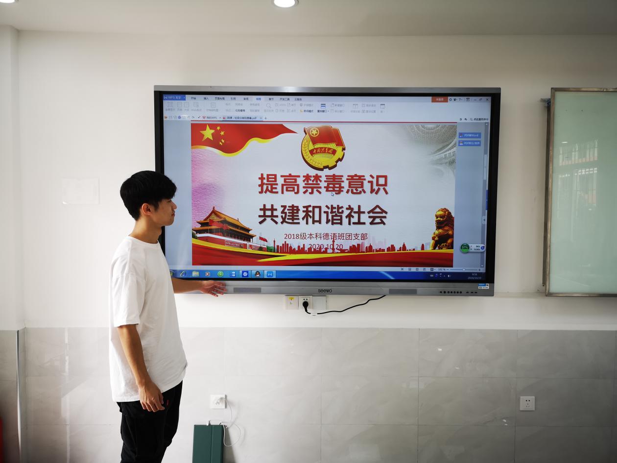 当代青年应坚持厉行禁毒方针,积极配合落实禁毒工作,为维护社会和谐稳定、保障人民安居乐业贡献力量。团支书邀请在座同学分享学习感悟,2018级本科英语一班刘天宇同学说道:“毒品的危害之大,于社会和个人而言都是十分深重的。党的禁毒方针与禁毒工作的落实所取得的成效是显而易见的,我们应该积极配合党的禁毒工作,共同维护和谐稳定的社会环境。”