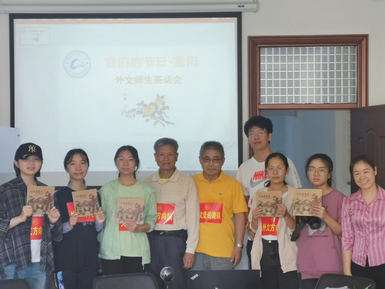 10月25日重阳节之际,为传承和弘扬中华优秀传统文化,坚持以社会主义核心价值观为引领,深入挖掘传统节日的文化底蕴和时代精神,激发广大青年学子强烈的民族自豪感和爱国热情,外文学院积极组织退休教师参加校院组织的重阳节系列活动,外文学子和退休教师一同登高望远、踏秋祈福,并在座谈会上亲切交流,共叙桑榆深情。