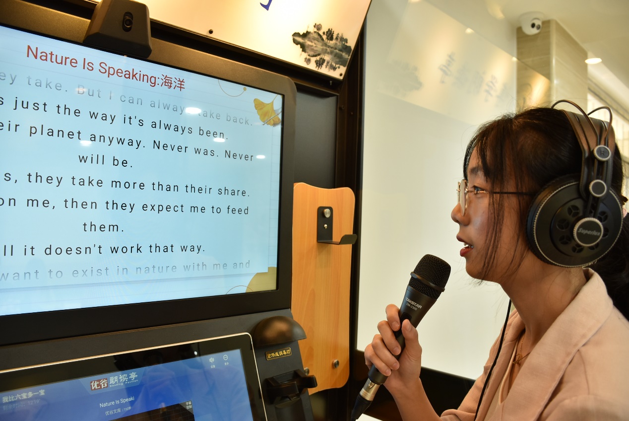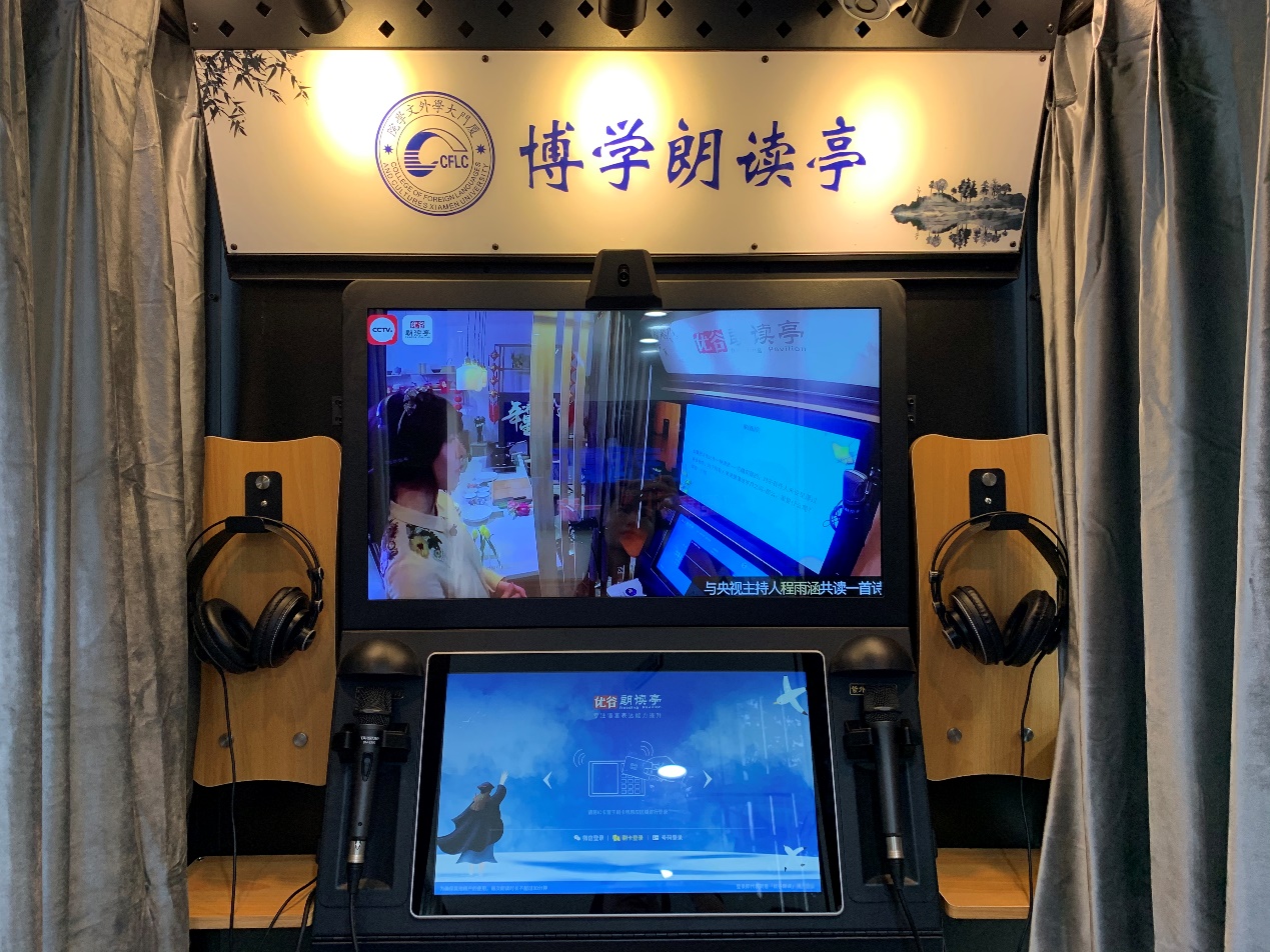 “博学朗读亭”具有配乐朗诵、绘本朗读、视频配音、朗读任务、自由朗读、排行榜、活动举办、口语测评、专家示范九大主要功能。系统配置5万多篇素材,5千余首古诗词、国学经典等专业范本及超多海内外精彩绘本,每周定期更新热门有趣影视视频内容,也可自带原创素材,满足个性化需求。同时朗读亭还能满足课堂作业的需求,实现即时评分、实时反馈、智能纠错等。“博学朗读亭”操作简单,只需用微信“扫一扫”朗读亭屏幕上的二维码,即可登陆并使用所有功能(学院也在朗读亭旁放置了使用指南,方便参考使用)。