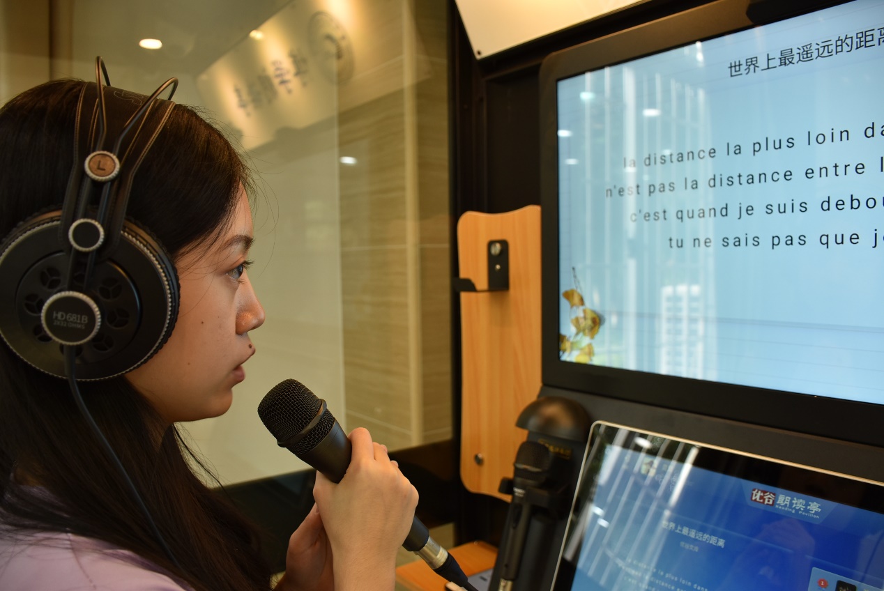 “朗读亭”的设计十分人性化,使用很方便,微信扫描亭内的二维码登录就可以开始朗读了。“博学朗读亭”极具外文特色,为我们学习外文提供了很多资源。我在首页选择“法语”后,就会看到很多法语朗读文本,既可以听标准录音,也可以自己来读。亭内的显示设备和耳机音质都非常好,体验极佳。