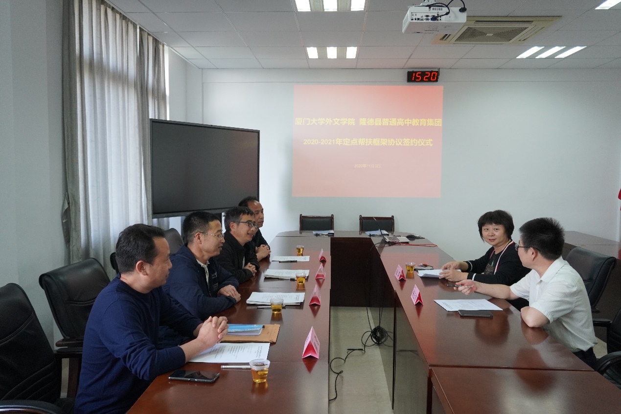 11月3日下午,厦门大学外文学院与隆德县普通高中教育集团2020-2021年定点帮扶框架协议签约仪式在德贞楼524会议室圆满举行。外文学院党委副书记杨云良,外文学院副院长徐琪,隆德县普通高中教育集团党总支副书记、副校长马俊明,教务副主任李鉴弼,政教副主任于宁,教师柳君出席会议。会议由杨云良副书记主持。