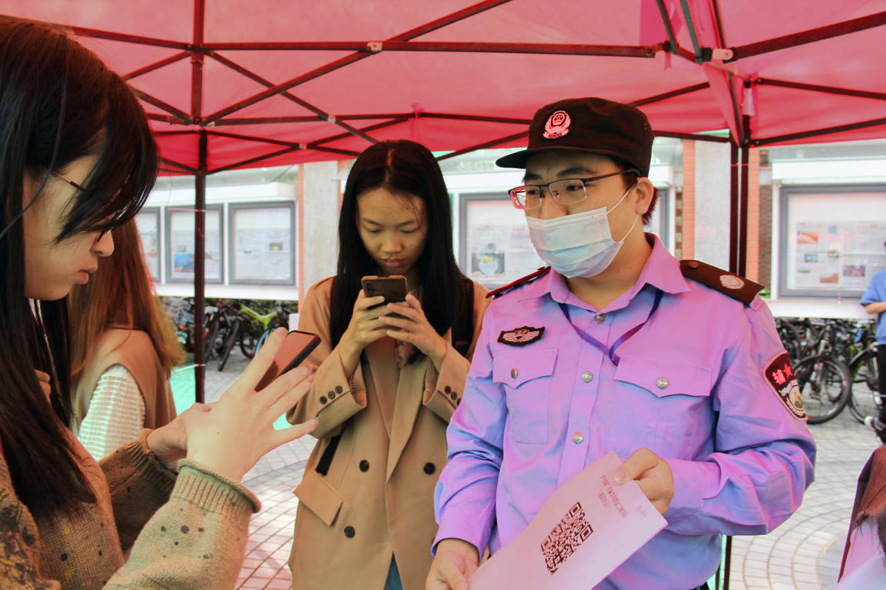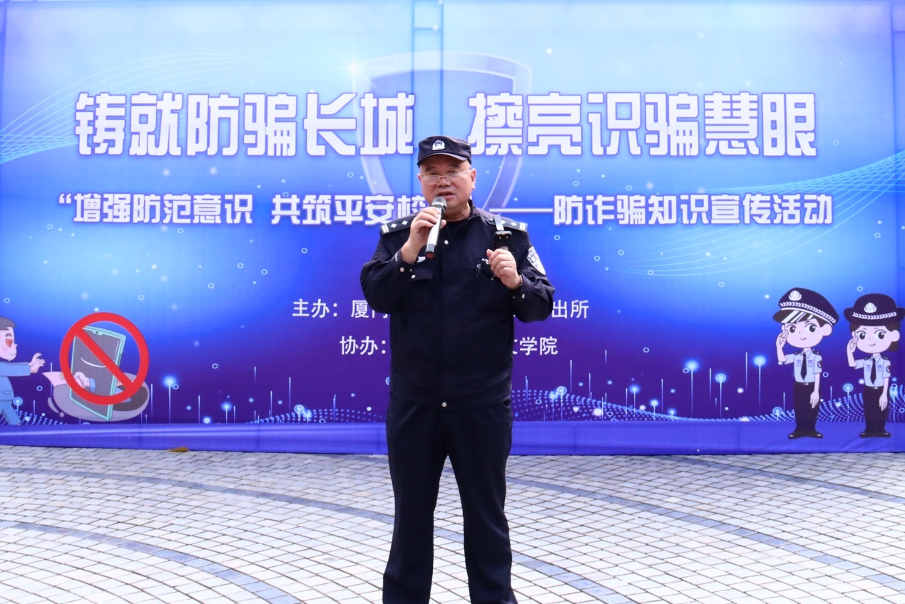 为进一步帮助广大学子有效辨别和应对诈骗行为,切实增强防范意识,11月10日中午,“增强防范意识 共筑平安校园”防诈骗知识宣传活动在三家村广场顺利举办。厦门市公安局大学路派出所教导员曾清勇、四级高级警长薛玉明、一级警长杨福全,外文学院党委副书记杨云良、沈丽秀及各年级辅导员莅临活动现场。外文学院全体学生参与了本次活动,共同学习防诈骗知识,提高自我保护能力。
