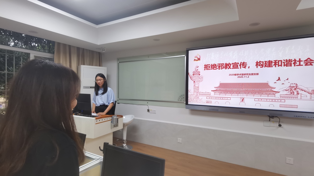 2020级研究生学硕团支部王文勤同学联系自身说到,作为大学生,作为遵纪守法的青年人,我们也应该远离邪教,遵守法律,加强自身抵御邪教的知识和能力,在社会上承担起相应的责任,努力构建和谐社会。从日常生活中来说,我们要提高鉴别能力,谨防误入歧途。对那些鬼鬼祟祟、跪天拜地的场所要自觉远离,对那些花言巧语、引诱入伙的人要多个心眼。我们要正确看待生老病死,积极参加有益的社会活动,保持自己身心健康,防止邪教乘虚侵袭。