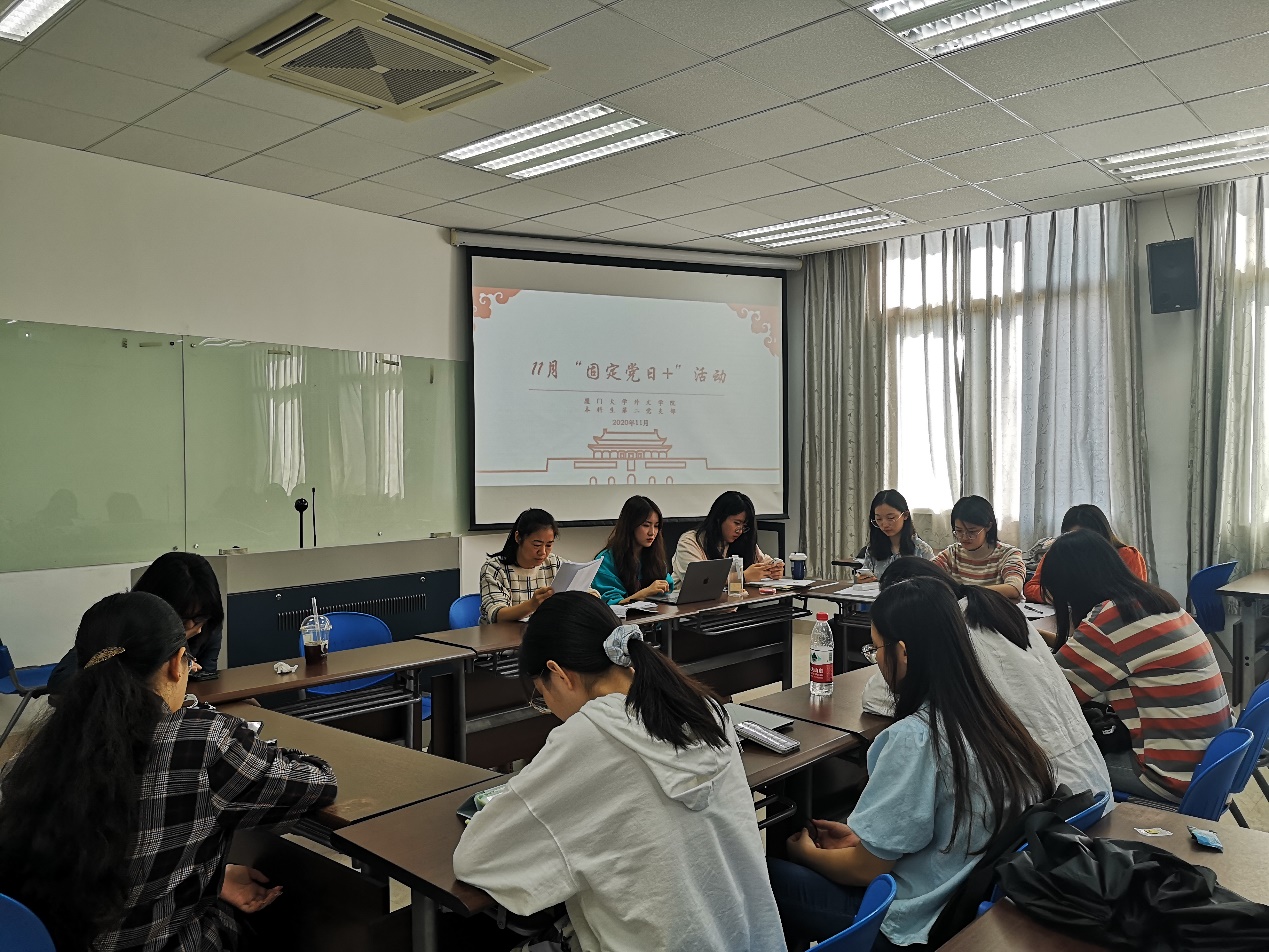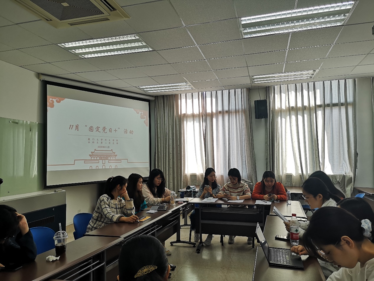 为了深入学习十九届五中全会精神,了解学习我国国民经济和社会发展第十四个五年规划和二〇三五年远景目标,外文学院本科生第二党支部于20201112日在德贞楼415开展了11月“固定党日+”活动。活动由本科生第二党支部书记戴晓燕主持,本科生第二党支部全体党员出席。