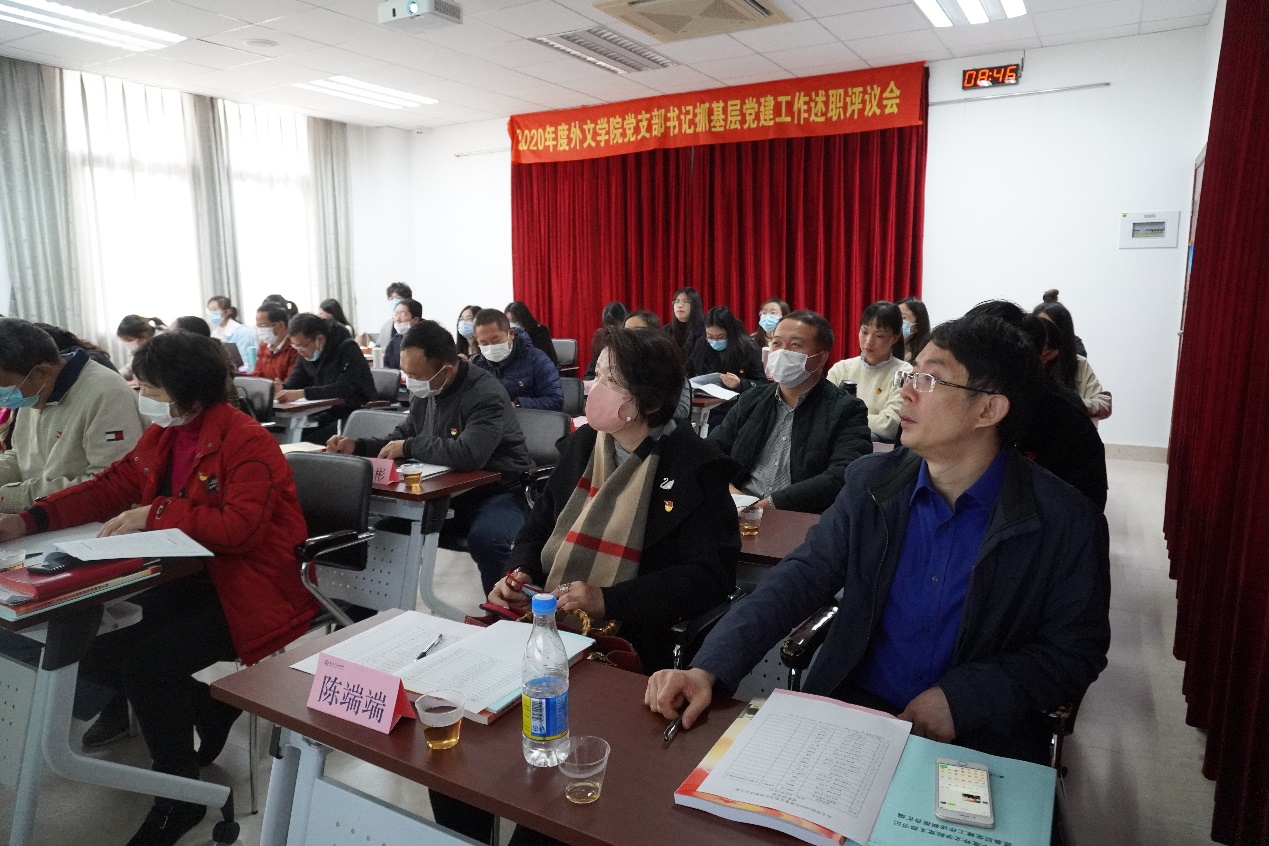 校基层党建工作联络员黄定基老师进行综合点评。黄老师指出,外文党委领导班子是坚定有力的,对党建工作敢抓敢管,扎实推进制度化、规范化。各支部在本次述职中准备充分、实事求是,提前将报告汇编成册,有利于相互交流,支部活动抓重点、有特色、人性化。在今后的党建工作中要继续保持,敢面对、敢斗争,抓意识形态、师德师风、网络安全,同时也要在统筹战疫工作中绷紧弦。