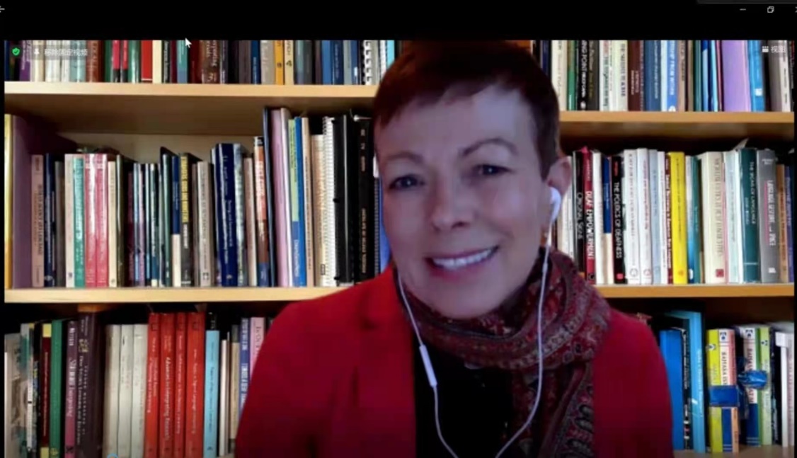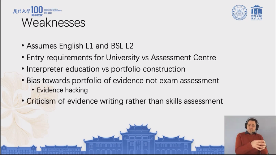 随后,世界手语翻译协会现任会长Christopher Stone教授作为线上参会嘉宾向听众介绍了英国手语译员评价的历史与现状。他指出,早在100年前,英国就已经出现非正式的手语译员。并以18世纪法庭手语翻译为例,说明在那之后很长的一段时间里,手语翻译、手语译员评价多与聋人福利工作相关。聋人福利工作基本由社会工作者负责。其公益性使政府逐渐开始介入。手语翻译逐渐机构化,相关专业认证逐步细化,学者和相关各方的参与也逐步深入。Christopher Stone教授最后提出手语认证要综合考量译员知识技能和手语传译水平,更要结合传统、课程加简历、多方评价等多种评价方式。