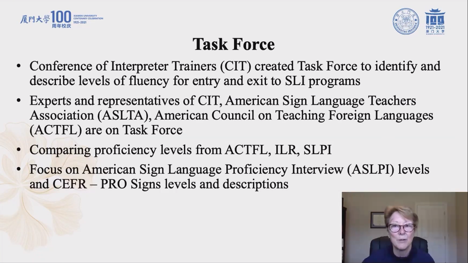 乔治敦大学社会语言学博士、美国加劳德特大学(加大)手语翻译系退休教授Cynthia B. Roy教授和乔治敦大学应用语言学博士,全美手语翻译教师中心(TIEM)主任Betsy Winston在线上做了发言。Cynthia B. Roy教授介绍了“手语翻译流利度”概念,指出目前的手语培训项目、院校大多“名不副实”,主要原因是缺乏清晰、明确、统一的准入、评价标准。她建议手语翻译也应建立入学与培训的“黄金”准则。Betsy Winston在发言中强调手语翻译实践、评价应注意“意义”本身。她批评以往的评价只注重信息和技能,缺乏效度。人们应聚焦口译的真正关键的环节,特别是一些微妙的交际线索,因为构建和理解意义是一个非常复杂的过程,意义的传递绝不是静态的数据传递。最后,她建议在量表设计中应关注意义重构和技能、素养体系,并细化等级间增量,方便学生进行自我审查。