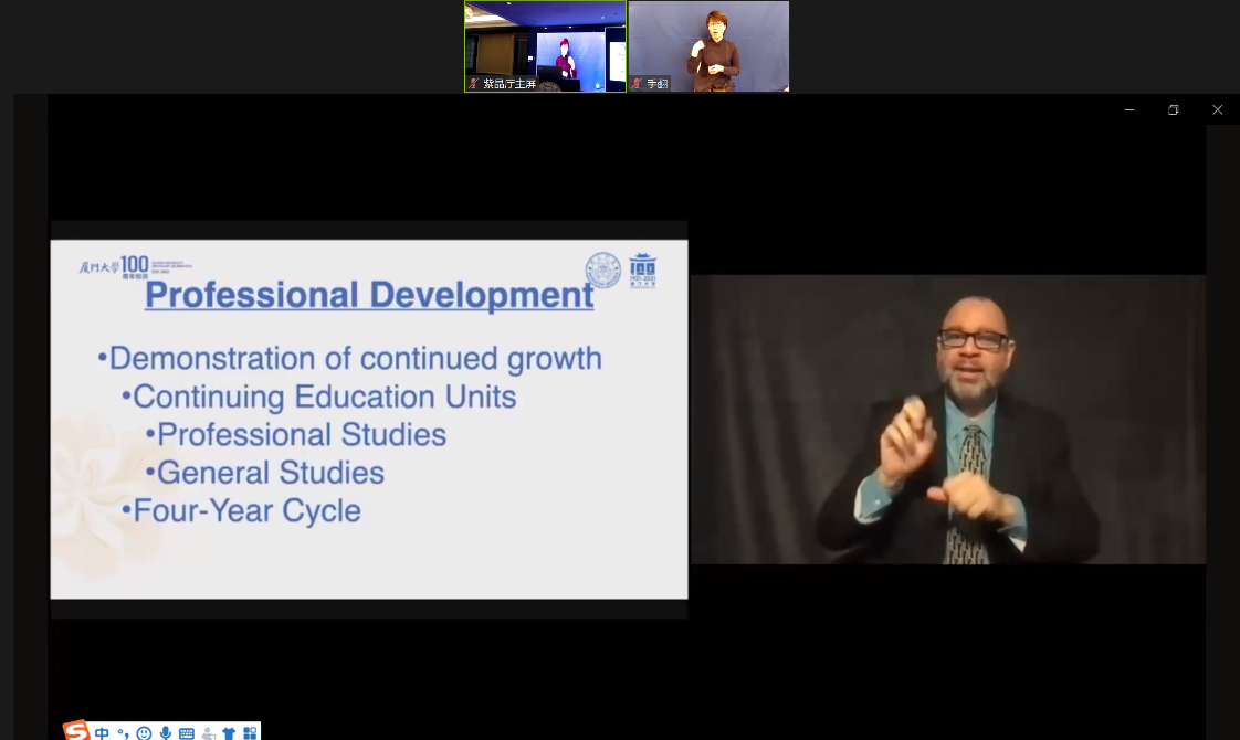 接下来,两位线上参与的外国专家做了分享。世界手语翻译协会前会长、美国大学手语翻译教育委员会(CCIE)委员Debra Russell向观众提出了几个问题:手语翻译能力是什么?如何评价?从入学到进入市场,我们的手语翻译评价模型是否有效?目前,在全球范围内,手语翻译评价主要由两大部分构成:书面考试和传译表现,其中书面考试涉及理论知识,传译表现则考察译员应付长短语篇、多种互动场景的能力,同时考察多种传译技能。Debra Russell教授认为语言测试应和传译测试分开。现有的实践(国际组织的经验、具体评价手段如共识模型、反馈模型等)可以提供借鉴,不同评价主体有不同的标准,彼此应加强合作。美国手语译员注册中心(RID)主席Jonathan Webb则从自身手语翻译经历出发,介绍了美国手语译员认证体系。该体系同时关注译员的职业道德和专业技能,并通过职业道德、测试体系和职业发展等三大认证模块和持续认证机制(Certification Maintenance)推动、鼓励译员不断进步。他最后的总结发人深省:取得认证不是终点,而是起点,认证是一个终身的旅程。