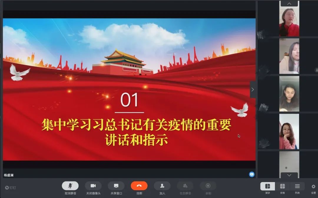活动开始,党支部书记杨盛澜同志结合身边实例,带领大家集体学习了习近平总书记关于新冠肺炎疫情防控的重要讲话精神,回顾了党中央在疫情防控期间的七项主要工作,引导大家进一步了解党中央的各项决策部署,增强疫情防控意识和防控能力。在学习到习近平总书记对党组织和党员提出的三个要求,即“必须牢记人民利益高于一切”“让党旗在防控疫情斗争第一线高高飘扬”“要发挥战斗堡垒和先锋模范作用”时,她号召支部成员积极发挥先锋模范作用,投身疫情防控,展现责任担当。
