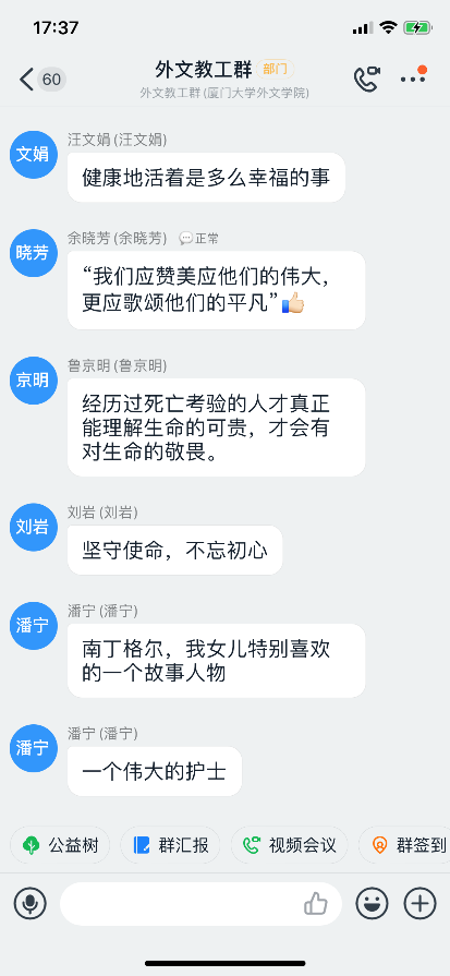 医疗队同志们分享了一个个鲜活的抗疫故事,用最质朴的语言讲述着人间大爱,触动着每一个人内心那份最炙热的情感。许多师生在观看过程中感动落泪,并积极在学院教工群或支部群中分享自己的学习感悟。“感动”、“感谢”、“自豪”、“向他们学习”……,这些词高频出现在大家的讨论中。