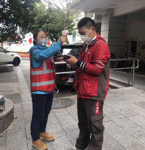 抗疫阻击战中的后勤担当。于丹红、杨耘硕等同志积极参与社区防疫志愿者工作,站好社区“排查兵”和“后勤兵”的岗位。