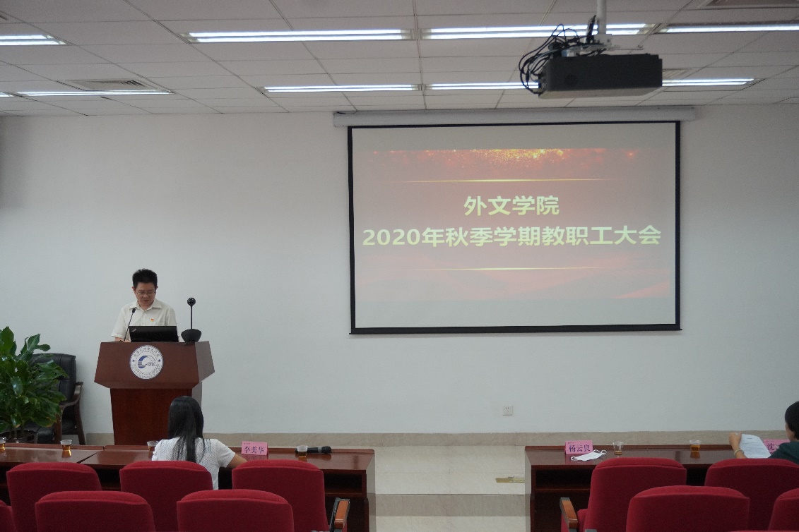 9月11日上午,外文学院在德贞楼112报告厅及313会议室组织召开2020年秋季学期教职工大会。院领导及全院教职工参加会议,会议由学院党委副书记杨云良主持。