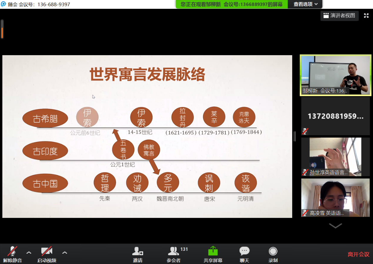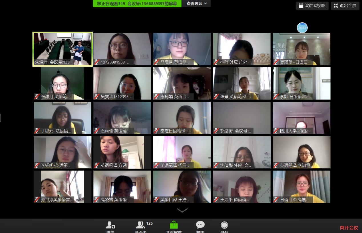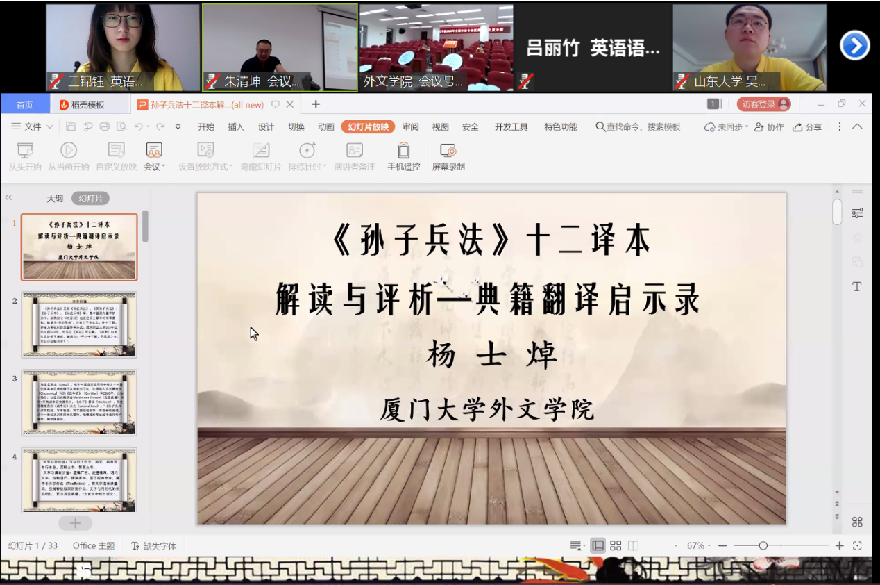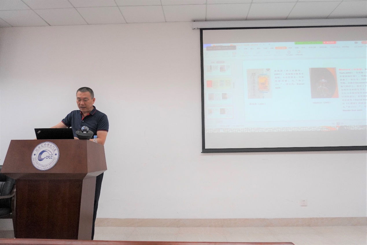 开营式后,三场干货满满的学科导航讲座和一场内容丰富的研究生生活面面观讲座以线上会议的形式开展。外文学院英语系主任杨士焯教授以“《孙子兵法》的十二译本”为切入点,介绍了中国的典籍翻译。在讲座中,杨老师向营员们介绍了《孙子兵法》的文本价值、文学价值与语言价值以及《孙子兵法》多个译本的异同,并围绕具体的文本进行了翻译赏析。杨老师深厚的知识底蕴与幽默的语言表达给营员们留下了深刻的印象。