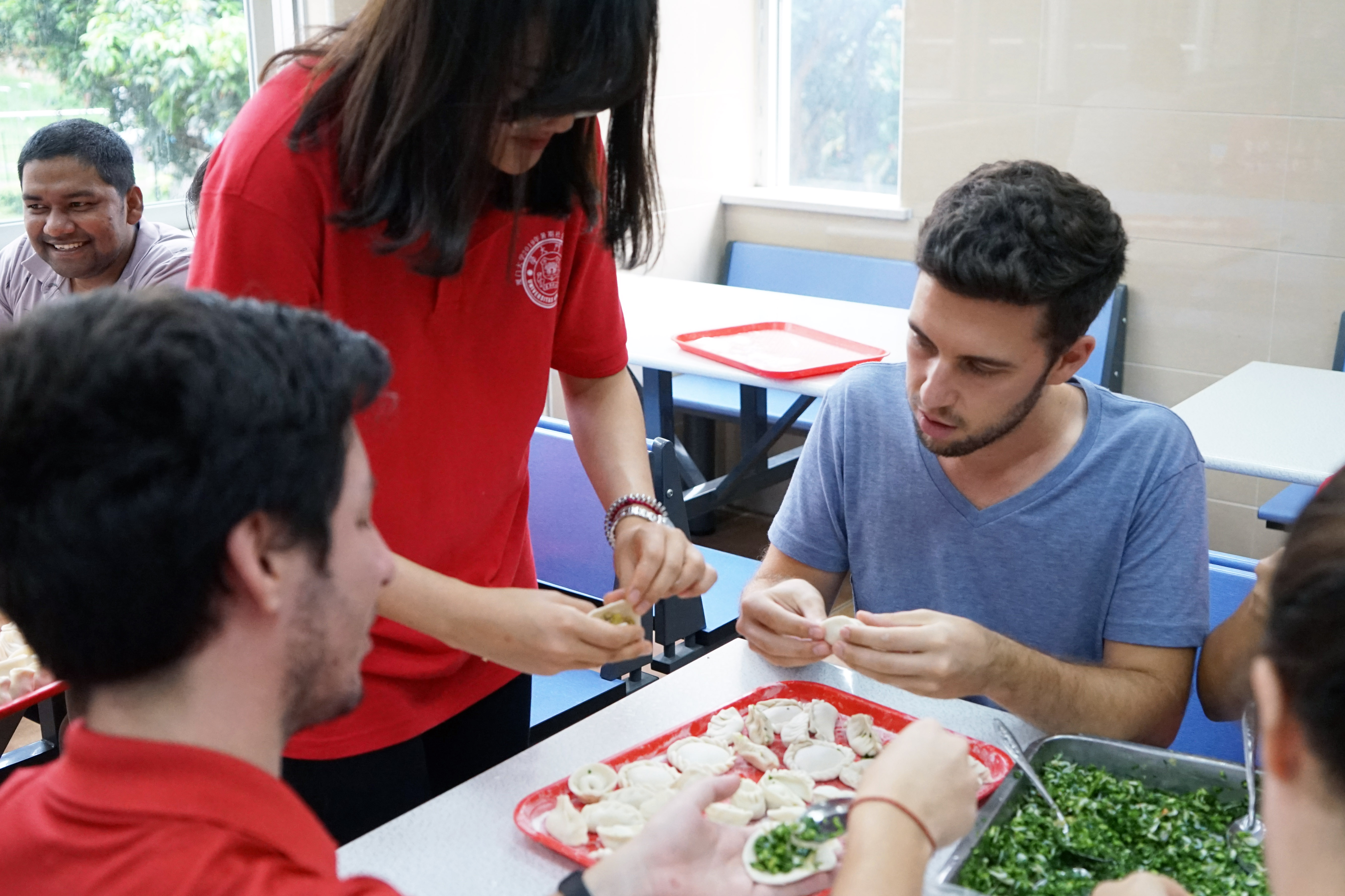 与其它课程不同,“中华传统美食”这一课程选择了芙蓉餐厅二楼作为教学场所。在向留学生介绍了饺子的起源、分类及其特殊的文化含义之后,实践队员们手把手教留学生如何包饺子。留学生们仔细模仿、耐心学习,逐渐掌握了各式包饺子技巧。最后,实践队员们还与留学生们一同品尝了热腾腾的饺子,现场气氛热闹融洽。