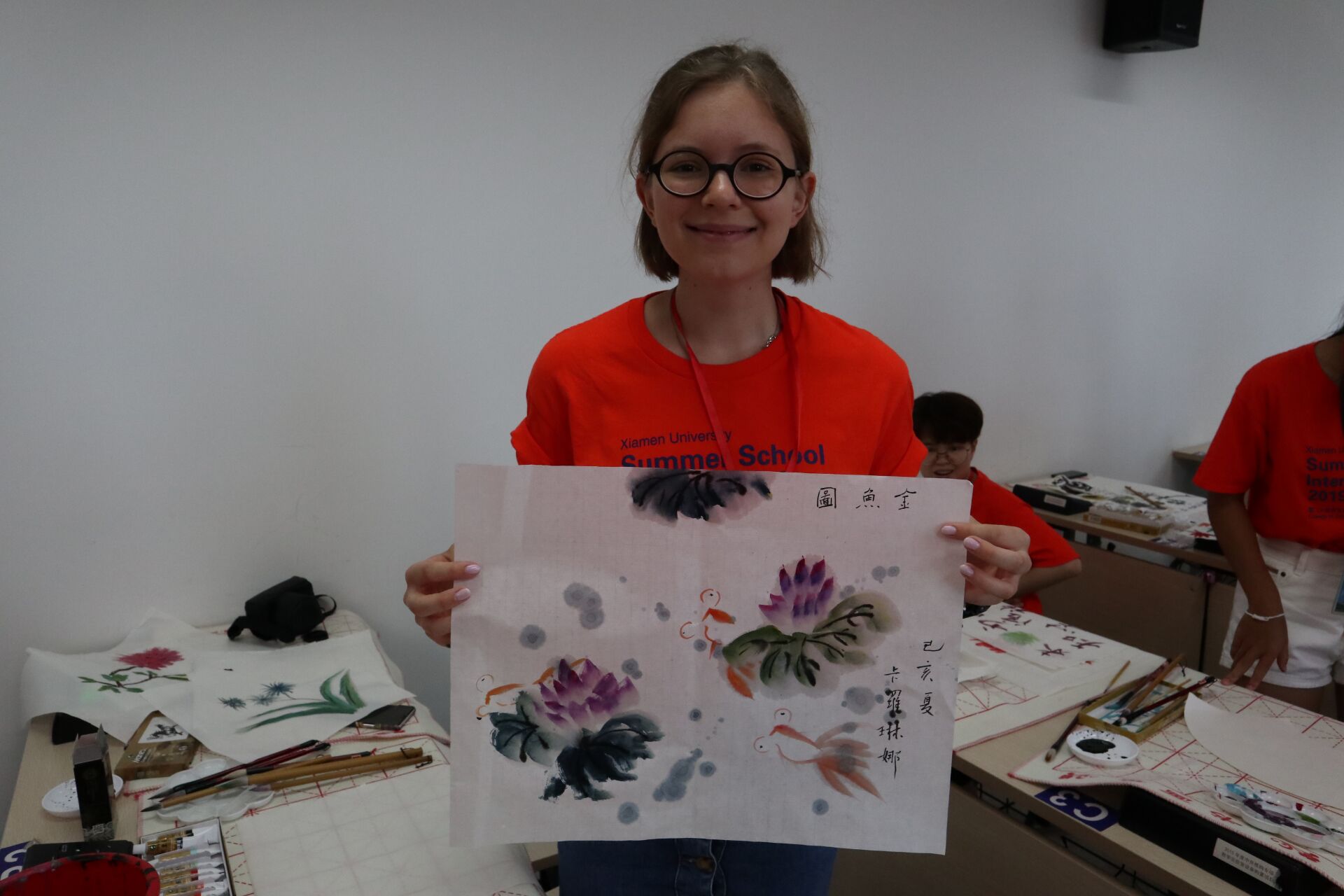 7月10日上午,营员们在厦门年轻书画家胡叶翎指导下,体验了中国传统水墨画。虽是第一次手握毛笔作画,在老师的精心指导,营员们笔下呈现出一幅幅颇有韵味的水墨画,让营员们欣喜不已。