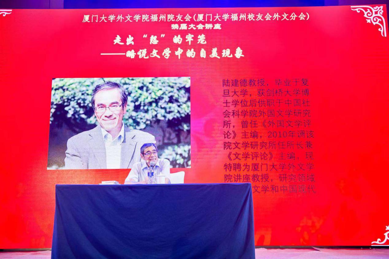 在换届大会开始之前,著名文学评论家陆建德应邀做了题为《走出“怨”的牢笼——略论文学中的自美现象》的讲座。陆建德教授曾任中国社科院文学研究所所长、《文学评论》主编,现特聘为厦门大学外文学院讲座教授。陆教授对中国一些古代文化名人一旦不得志就牢骚满腹,以致“怨”成为很多诗文的主要基调的现象做了批判,提出自我只有通过关注他人命运来融入共同体,博爱必须以克服“怨”为前提。陆教授在讲座中旁征博引,授课内容生动有趣、给大家送上了一份文化审美大餐,赢得了在场听众的阵阵掌声。