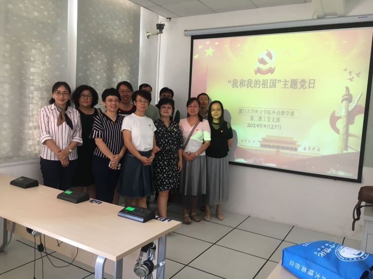 根据外文学院“不忘初心、牢记使命”主题教育的工作部署,外语教学部第二教工党支部于2019年9月27日上午在学院南光三223开展以“我和我的祖国”为主题的“固定党日+”活动。党支部书记汪文娟主持会议。