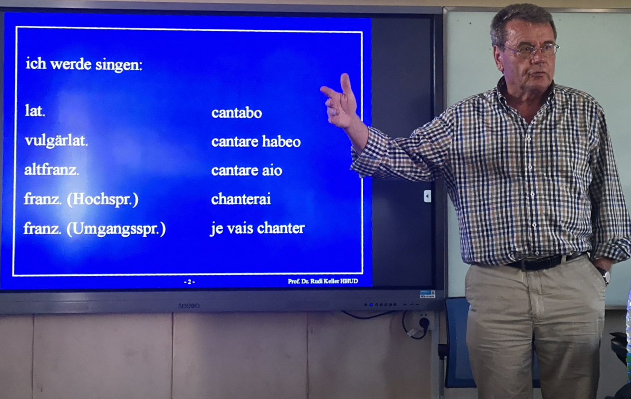 2019年10月21日,德国杜塞尔多夫大学教授、语言学家鲁尔道夫·凯勒(Rudi·Keller)先生来到我院,于上午10点和下午14点30分,为我院德语专业全体同学带来了题为“关于语言的变迁”和“德语有衰败的危险吗”两场德语语言学专题的学术讲座。