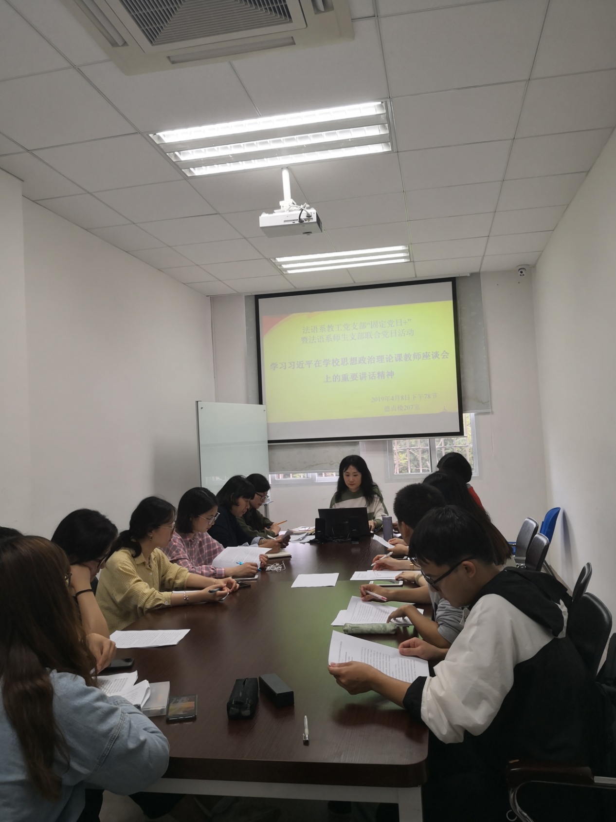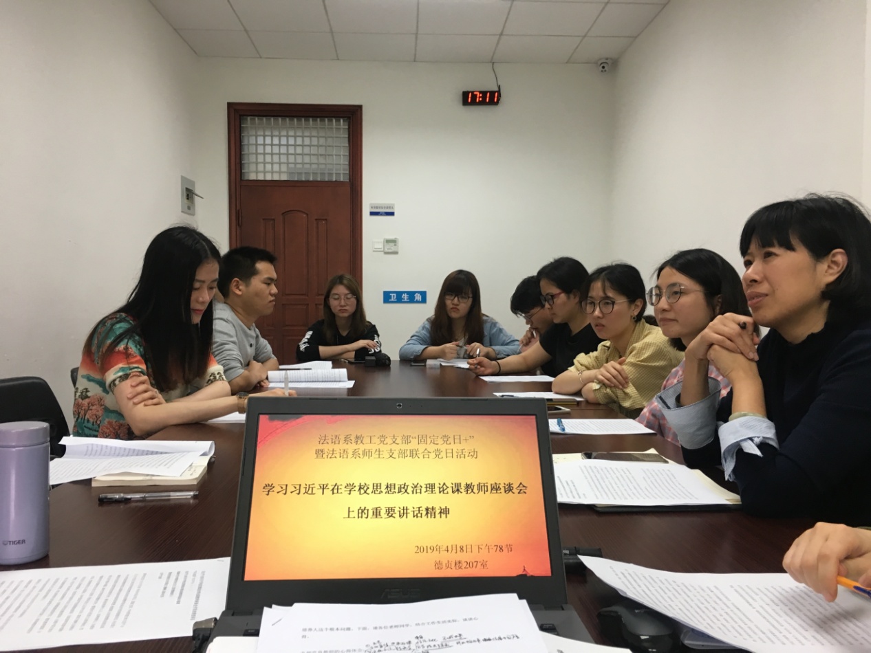 2019年4月8日,法语系教工党支部在德贞楼207室举行了习近平总书记在学校思想政治理论课教师座谈会上的重要讲话专题学习会。外文学院沈丽秀副书记列席指导。法语系本科生党员以及入党积极分子代表受邀参与学习。外文学院沈丽秀副书记列席指导。
