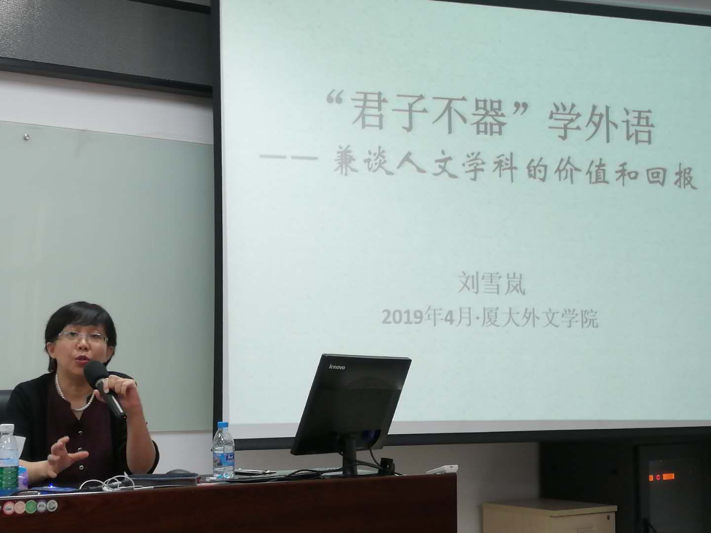 刘雪岚教授的讲座题为“君子不器——兼谈人文学科的价值与回报”。刘教授引用《论语·为政篇》中“君子不器”的观点,指出21世纪的大学需要培养的人才并不是单纯地追求某一项专业技能,而是拥有长远眼光、有智慧、有哲理、有修养的高素质人才。具体到外国语言文学学科,新时代的外语学科要培养的人才不仅仅要拥有专业的语言技能,更要有深厚的文学与文化素养储备。刘教授结合如北京大学、复旦大学、耶鲁大学、洪堡大学等国内外知名高校的外语人才培养方案指出,外语学科教学不仅要通过科学的训练方法进行基础性的语言、文化、历史、科学知识的传授,更要注重学生高尚道德的陶冶以及个性品质的训练。刘教授认为,学习外语不应当把语言当作一种简单的工具来看待,更要感悟语言背后悠久的文化精髓和思维方式,才能在自身修养不断冶炼的过程增加文化自知,实现中西方文明传统的融会贯通。刘教授的讲授深入浅出,感情充沛,拓展了大家对外语类人才培养方法的认识,对我院师生的专业教学和学习极具借鉴意义。