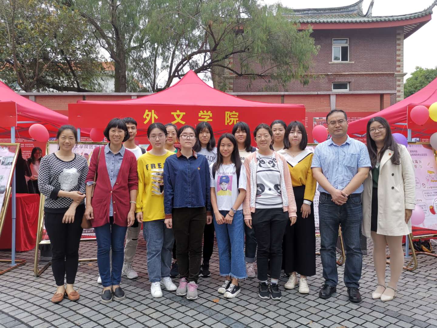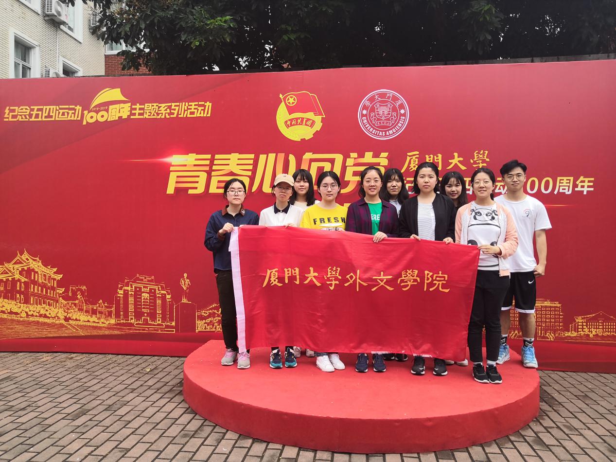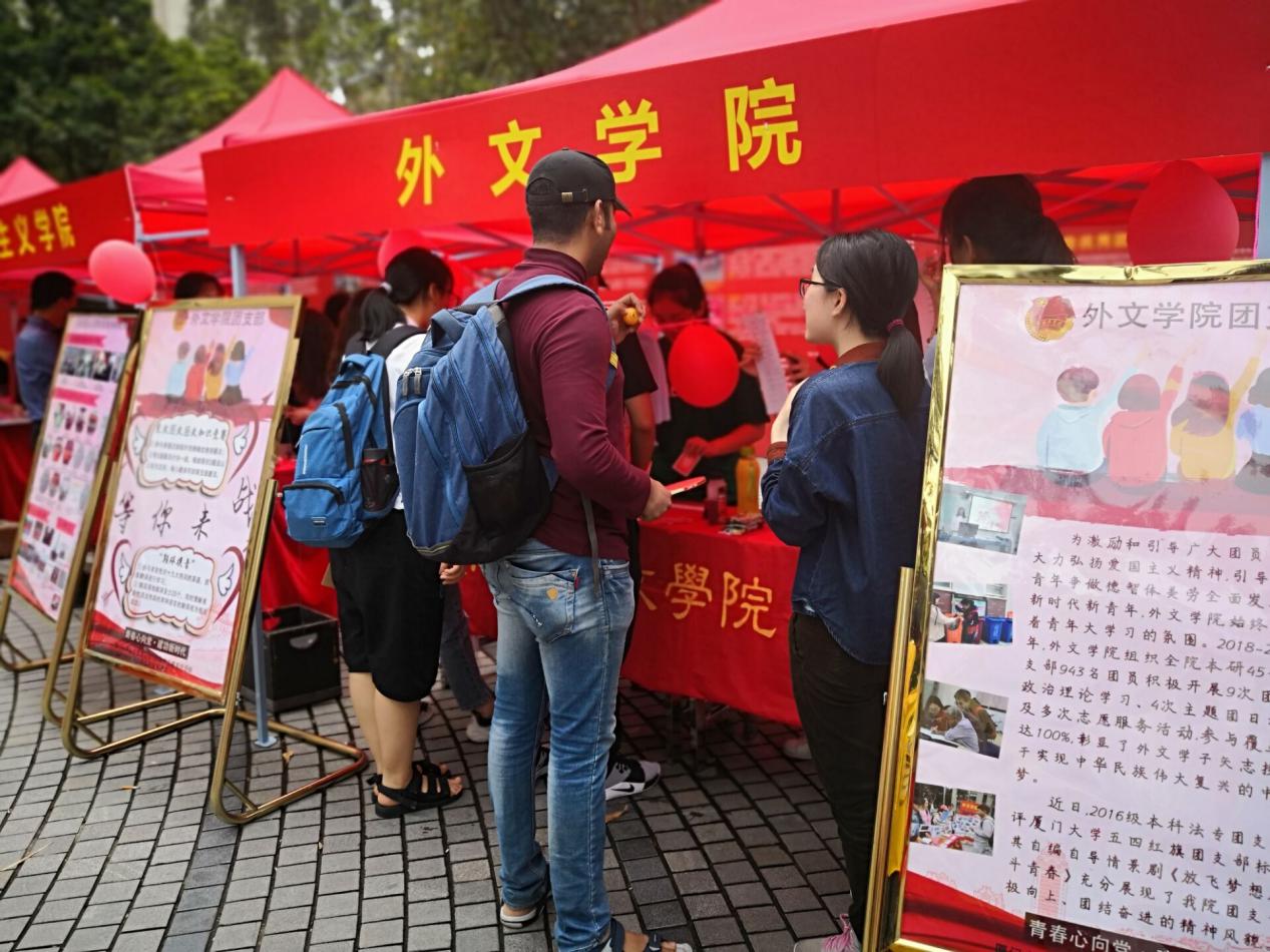今年是中华人民共和国成立70周年、五四运动100周年。为纪念五四运动,弘扬“五四”精神,展现厦门大学青年学生健康向上的精神风貌,增强共青团的凝聚力和向心力,厦门大学纪念五四运动100周年主题系列活动之活动广场活动于5月5日在三家村广场顺利开展。外文学院积极响应校团委号召,组织2018级英语专业本科3班团支部和2017级西班牙语本科团支部作为代表参加了基层团组织风采展示活动。活动当天,外文学院党委副书记沈丽秀,团委书记、研究生辅导员乐无恙,团委副书记、2016级本科生辅导员戴晓燕和2018级本科生辅导员杨盛澜等老师到场参加活动。