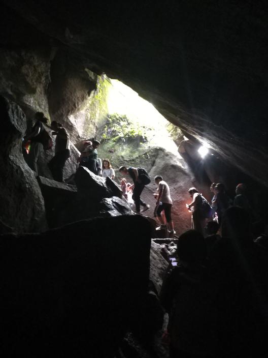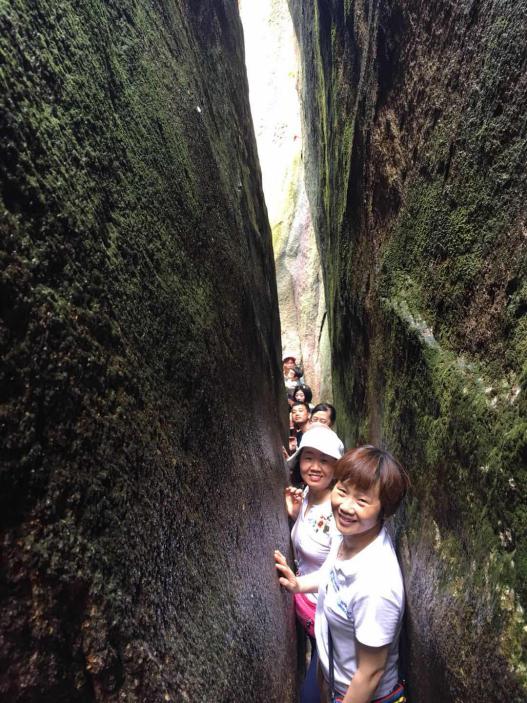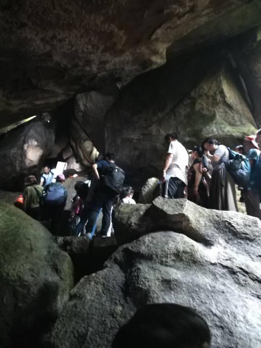 然而更令人称奇的是,当你以为要沿着原来的道路上山时,面前出现的却是一个亭台,绕过去便是“千人洞”。洞中岩石遮住了烈日,瞬间袭来阵阵凉意。大家相互搀扶,顺着窄窄的石路蜿蜒而上。水滴时不时从石缝中滴下,落到我们身上,冰冰爽爽。