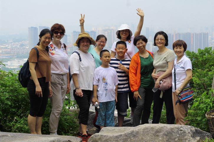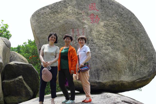 游览了“一线天”之后,一部分老师继续前行至海拔280米的山顶,并在“风动”石旁居高望远。