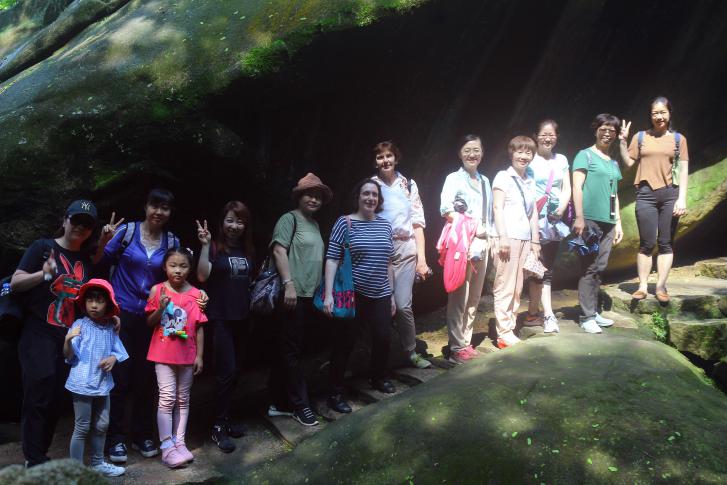 云洞岩树木繁茂、郁郁葱葱。在导游的带领下,老师们行走在山岩突兀,怪石嶙峋山路上,有的研究着刻在山石上的题字,有的不时俯瞰山下美景。微风传递着清脆婉转的鸟鸣声,周围的美景令人心醉神迷,不禁让人想起现代诗人林金宝的诗句:“登高漫步吟今古,曲径通幽媲艳姿”。