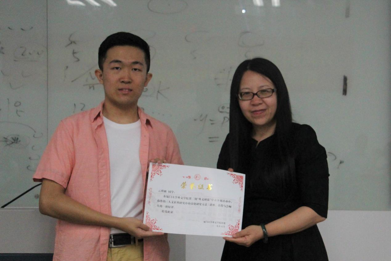 5月24日下午15时,厦门大学外文学院第二期“外文研说”学术沙龙活动在德贞楼415如期举办。我院2017级英语语言文学专业硕士生云程彬受邀进行题为“人文社科研究中的量化研究方法”的讲座,副院长辛志英教授出席了本次活动。