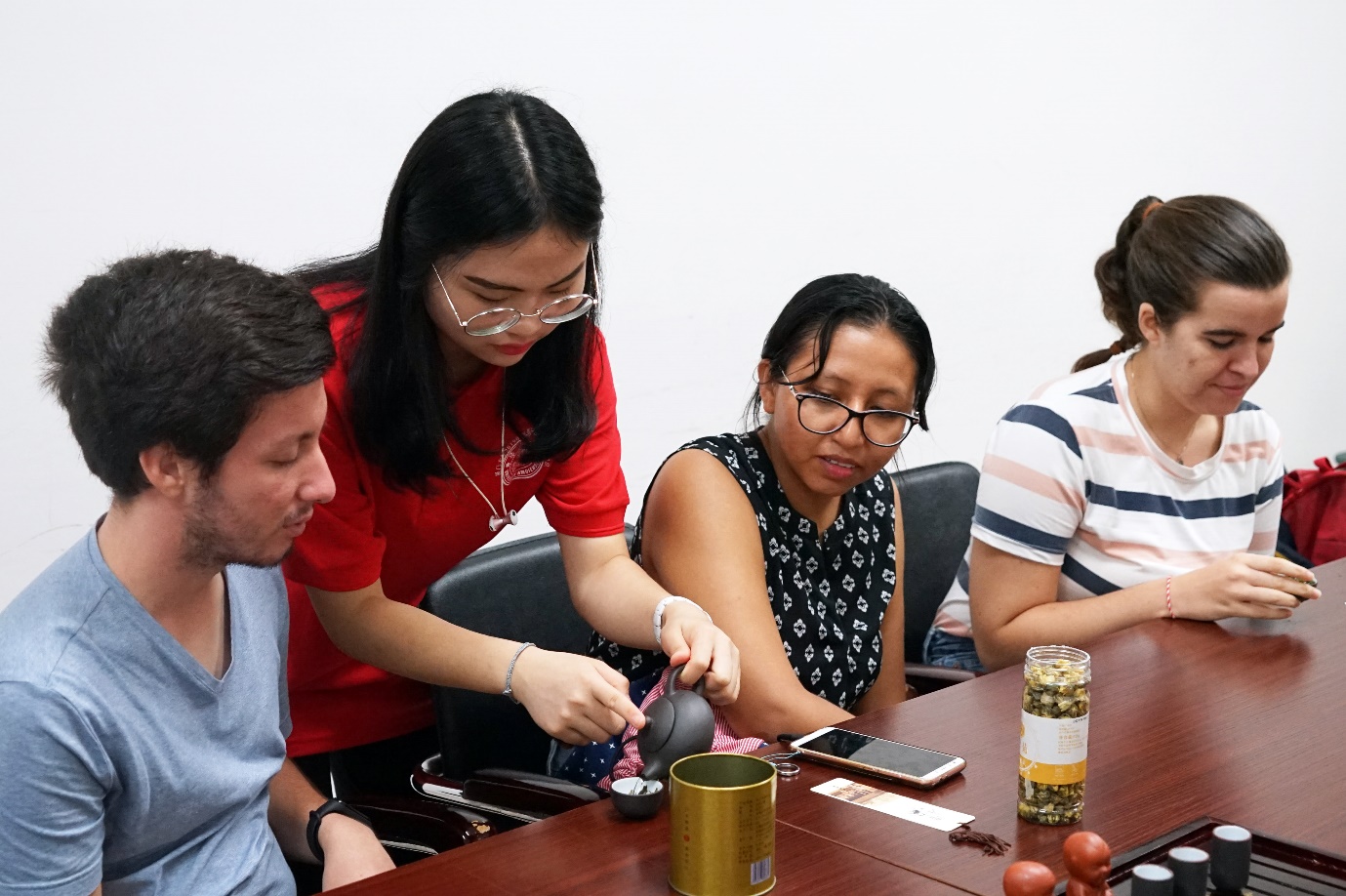 详细的理论讲解后,实践队员们手把手指导留学生们如何泡茶。大家纷纷选择了自己喜欢的茶叶,亲手沏茶、品茶。在茶叶的芳香中,留学生们亲身感受了中国茶文化的魅力。实践活动还特别设计了轻松有趣的游戏环节,留学生们通过香气来分辨不同种类的茶叶,现场欢声阵阵,气氛十分热烈。在最后,实践队员让留学生们挑选各自最喜欢的茶叶,并将茶叶赠予他们留作纪念。
