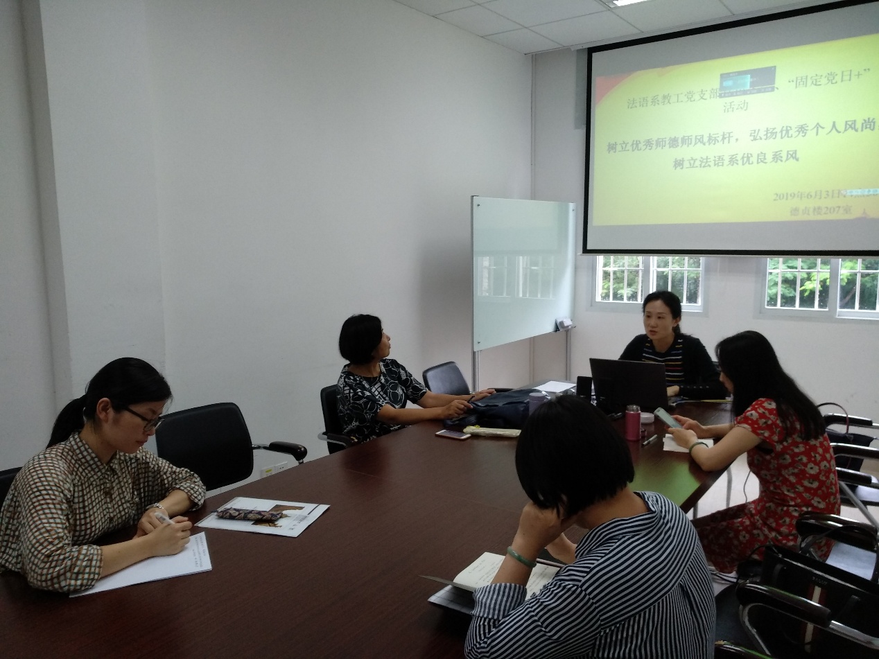2019年6月3日下午14点30分,法语系教工党支部在于德贞楼207召开支部党员扩大会议并开展进行6月“固定党日+”活动。支部党员鲁京明、龙佳、翁冰莹、郭兰芳与会。法语系党外教师沈澍、黄钏列席。
