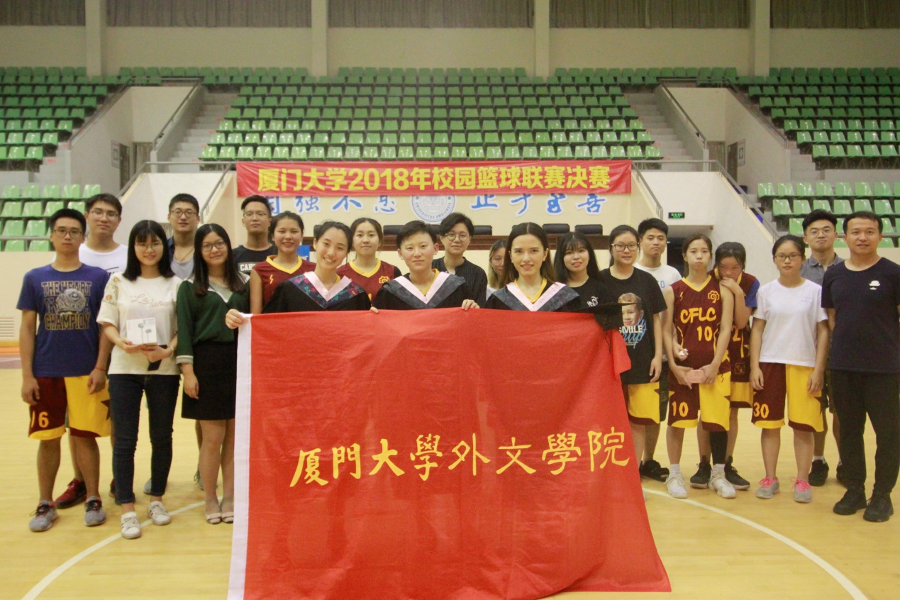 6月7日晚,厦门大学2018年“超级杯”篮球联赛季军赛在明培体育馆落下帷幕。经过激烈的角逐,外文学院惜败法学院,取得了第四名的好成绩。外文学院2017级本科生辅导员蔡宇老师、2014级本科生辅导员杨盛澜老师到现场观战,为队员们加油助威。