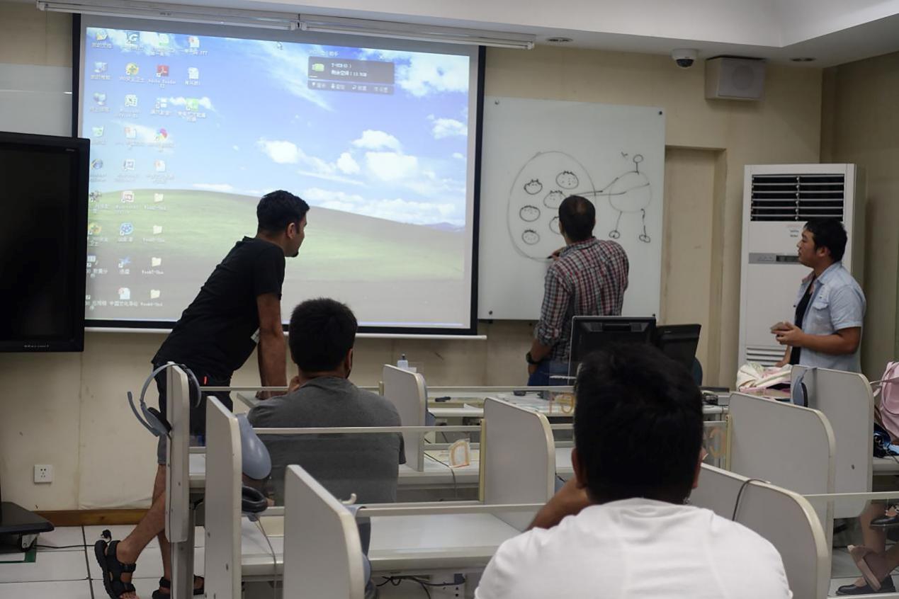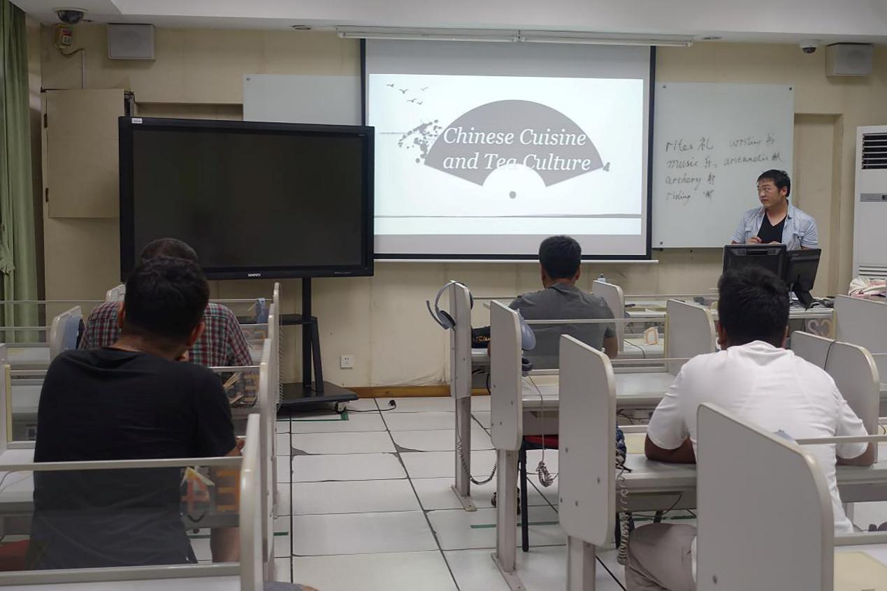 7月6日,实践队开展了以“走进中国”和“一带一路”为主题的文化交流活动。实践队员们简要介绍了古代丝绸之路文化和以四书、五经、六艺、四大名著为代表的中国古典文化。同时,采用视频与讲解相结合的方式,详细介绍了中国特色饮食和茶文化。实践队员们的充分准备和精彩展示,让留学生们走近中国,揭开了中华文化面纱。在课程的尾声,实践队员们精心准备了轻松有趣的游戏环节,积极与留学生们进行交流互动,课堂气氛轻松活跃。