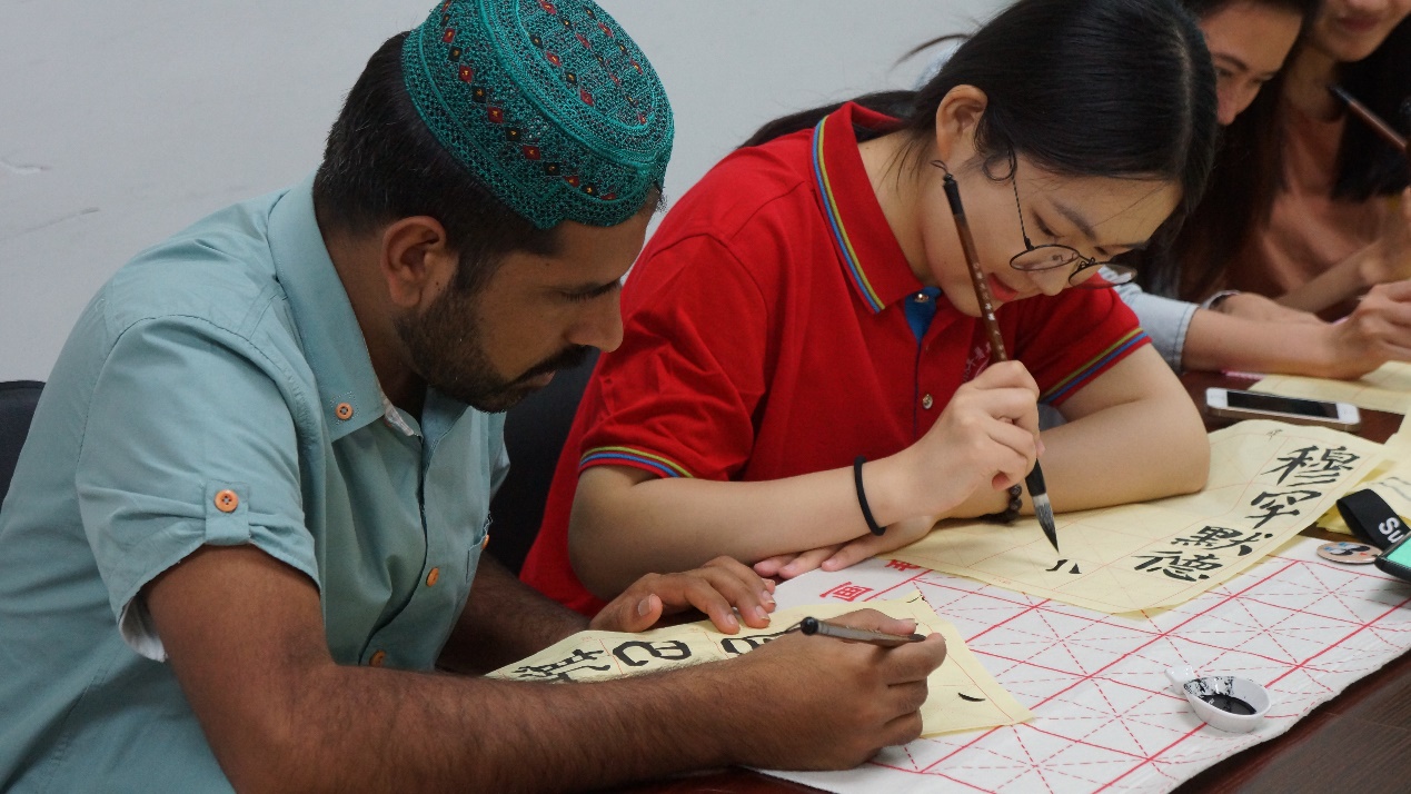 在以中国书法艺术为主题的活动中,实践队员们首先简要介绍了中国汉字的演变、古代书法的几大派别及其风格以及笔墨纸砚的使用方法。随后,实践队员们手把手地教留学生们如何写书法,从握笔姿势到笔画书写,实践队员们一一耐心示范,留学生们也认真练习,感受到了书法的乐趣与魅力。