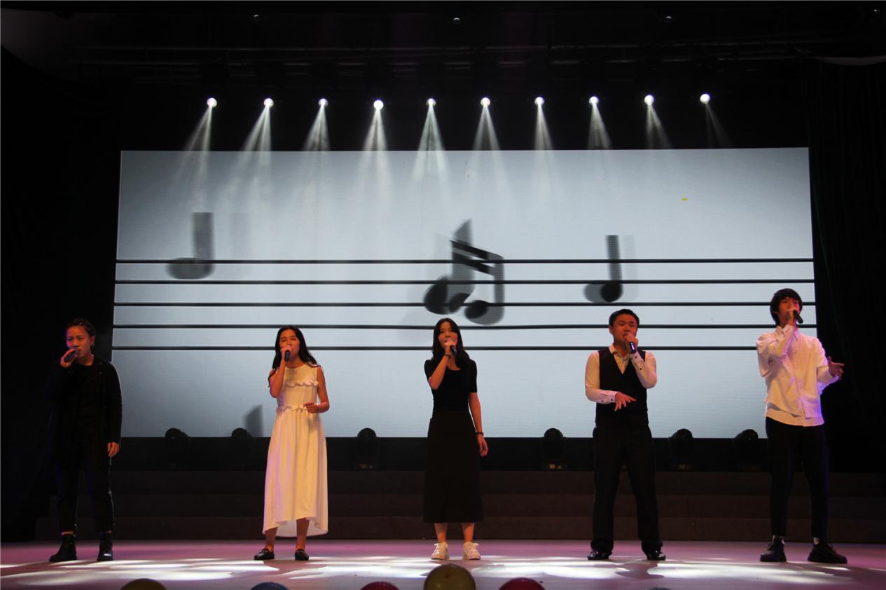 在BLINKY乐队的暖场表演后,晚会正式拉开帷幕,进入第一篇章“十八岁的青春,一串风铃”。首先登场的Rubato人声乐团带来了阿卡贝拉表演《Somebody that I used to know》,整齐而富有层次感的人声配合与黑白色调的衣着完美融合。由外文、法学和信息学子联合演奏的《钢琴、弦乐与管乐的对话——新海诚动画主题曲合奏》呈现了钢琴、低音提琴、小提琴、长笛、吉他与电子合成器完美的交汇融合,使合奏既有不染尘埃的优雅,又带有温暖人心的烟火气。