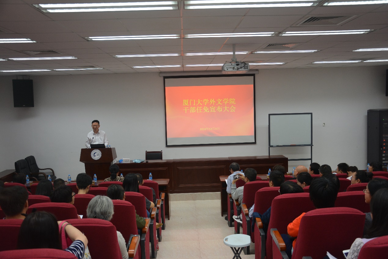 2018年12月3日下午,厦门大学外文学院院长任免宣布大会在南光三112报告厅举行,校党委副书记、副校长李建发、组织部部长孙理出席会议,学院领导班子成员、全体教职工参加了会议。会议由孙理部长主持。