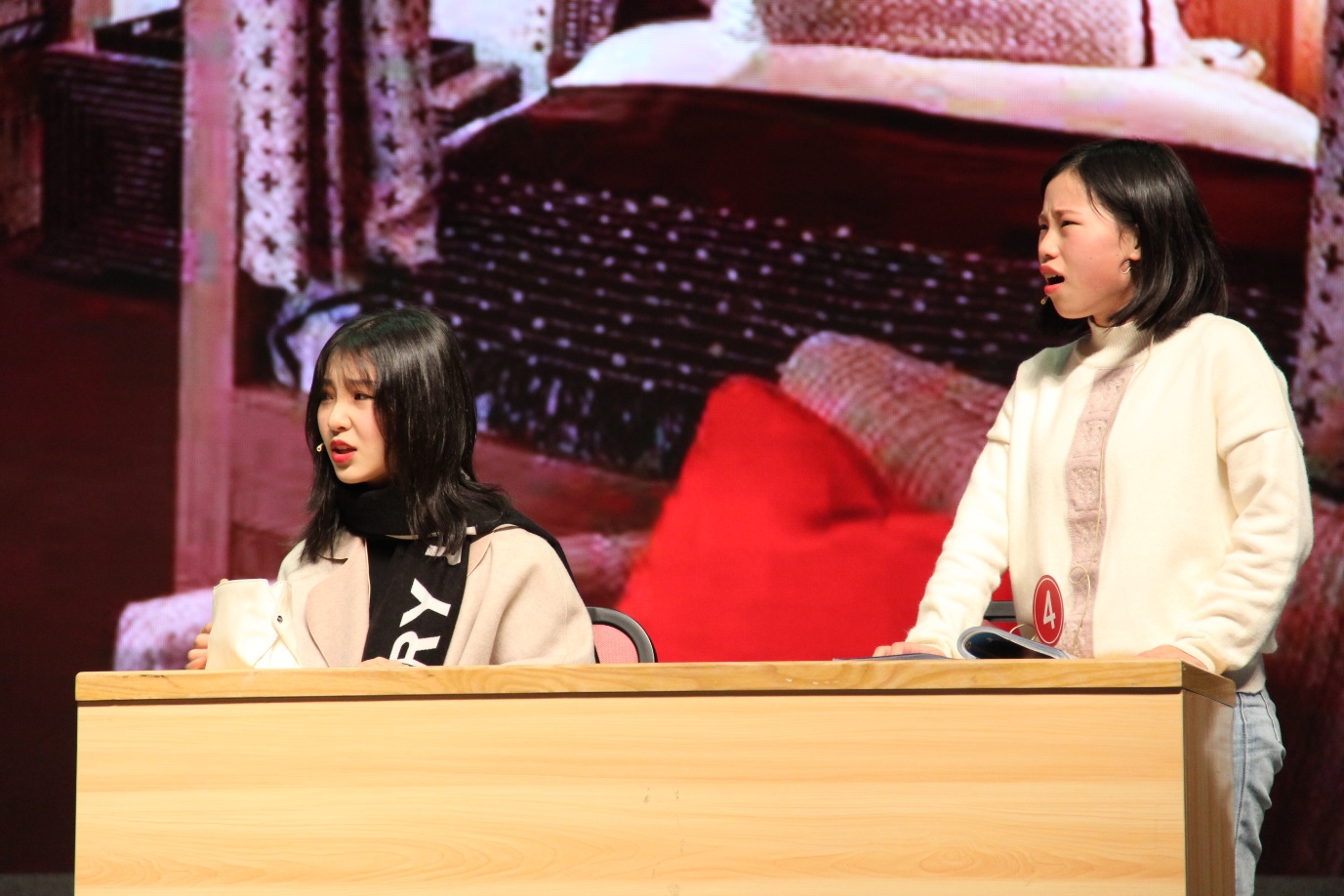 《冰释》的主要角色夏心瑶、熊莉莉、王珏、李丹分别由2018级本科生梅雨晴、谢鸿飞、廖婧仡和廖诗语同学饰演。舞台上,她们的一举一动配合默契,一言一笑感情充沛,生动地刻画了四个性格迥异的人物形象,自然生动的表演再现了现实中的大学生活。观众们仿佛从中看到了相似的经历,随着故事情节的发展或欢笑或沉默,想起初入大学时也曾经迷茫的自己,如何破开心中的冰雪、找寻到真正的自我……