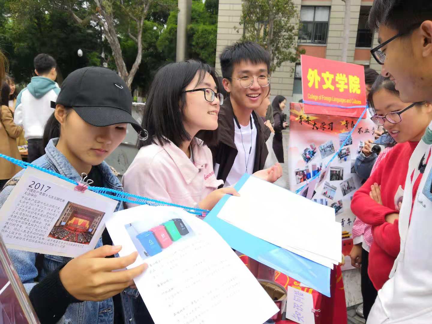2018年12月5日是第33个“国际志愿者日”。在“奉献,友爱,互助,进步”的青年志愿者精神的引导下, 为了展示基层团组织的风采,增强团支部吸引力、凝聚力和战斗力,12月7日,厦门大学“团支部公益团课团日创意市集”在三家村广场顺利举办。外文学院团委积极响应校团委号召,组织2018级本科英语专业三班团支部和德语专业团支部作为代表,以现阶段我院“垃圾分类劝导志愿活动”成果为主要展示内容参加了创意市集展示。