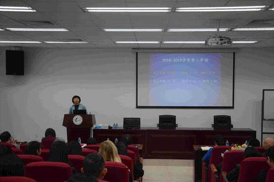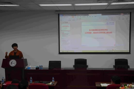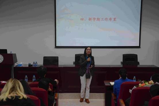 接下来,陈菁院长作题为《全力备战第五轮学科评估以评促建,推动外文学科再上新台阶》的报告,全面的介绍了学院面临的机遇和挑战,并对新学期的重点工作进行部署。她希望全体教职工拿出更多的勇毅,攻坚克难,力学笃行,把外文学院的各项工作抓好抓实,全力推进外文学科建设。