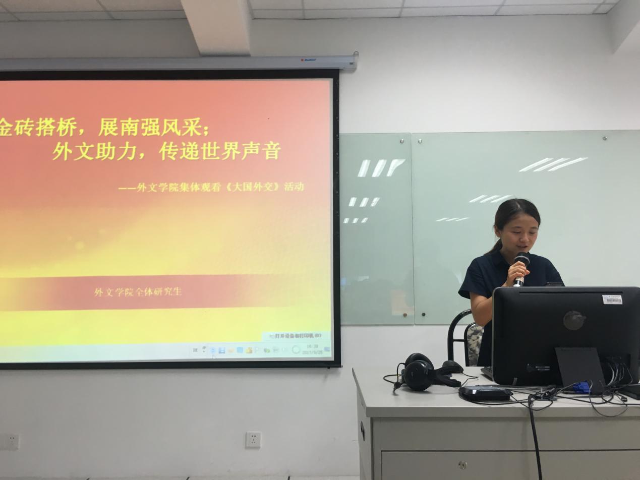 为确保学生学习成效,外文学院创新学习与组织形式,将政治理论学习与学生团支部团课相结合。9月25日,全体学生以团支部为单位,围绕“金砖搭桥,展现南强风采;外文助力,传递世界声音”主题开展政治理论学习交流活动。同学们首先集体观看了《大国外交》纪录片,随后结合这部政论专题片的内容、自身的专业学习、金砖志愿者服务经历和以往的“团课团日”活动等畅谈心得体会,现场气氛十分热烈。