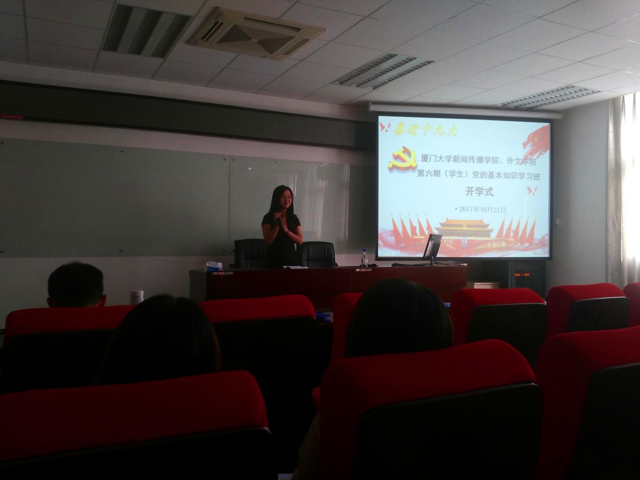 10月21日下午两点半,厦门大学党委党校第66期(学生)党的基本知识学习班(外文学院、新闻传播学院)开学式在南光三313报告厅举行。新闻传播学院党委副书记聂鑫,新闻传播学院团委书记、带队老师戴蓥,外文学院辅导员、带队老师周晓牧等领导老师出席了此次开学式,共计30名外文学子与26名新传学子参加本次党校培训。开学式由周晓牧老师主持。
