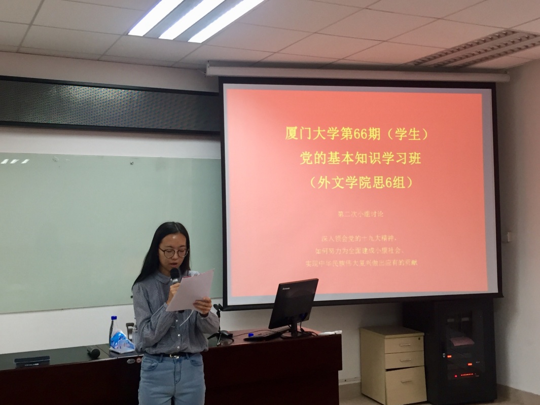 厦门大学外文学院第66期(学生)党的基本知识学习班外文学院思6组第二次小组讨论于10月28日下午五点半在外文学院教学楼南光三313举行。此次小组讨论的主题为“深入领会党的十九大精神,如何努力为全面建成小康社会、实现中华民族伟大复兴做出应有的贡献”。带队老师周晓牧老师参加了此次小组讨论,20名党校学员悉数参加,先后发表了自己的心得体会。