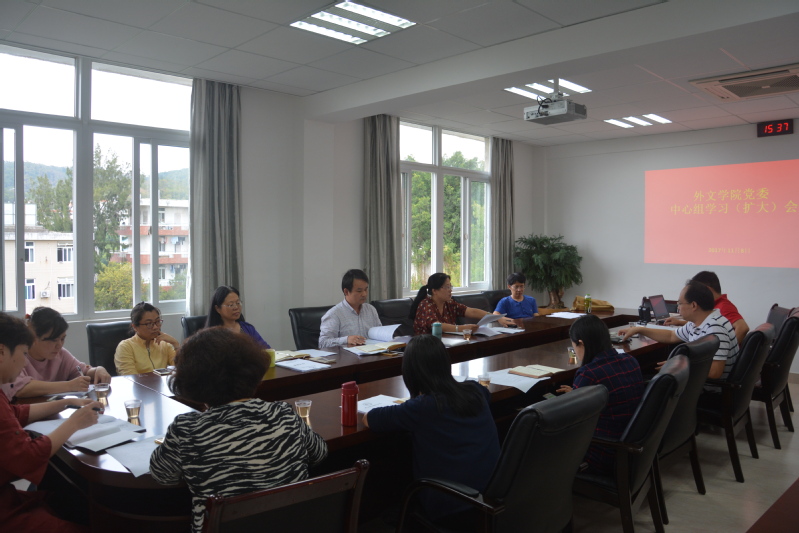 11月8日下午,外文学院党委在南光三524召开本学期第一次中心组学习,专题学习党的十九大精神。院党委委员、党员系(部)主任、教工党支部书记,院工会主席,院办公室主任,院团委书记、副书记等中心组成员与非党员院领导、学院科级干部、财务人员共同参加,会议由陈志伟书记主持。