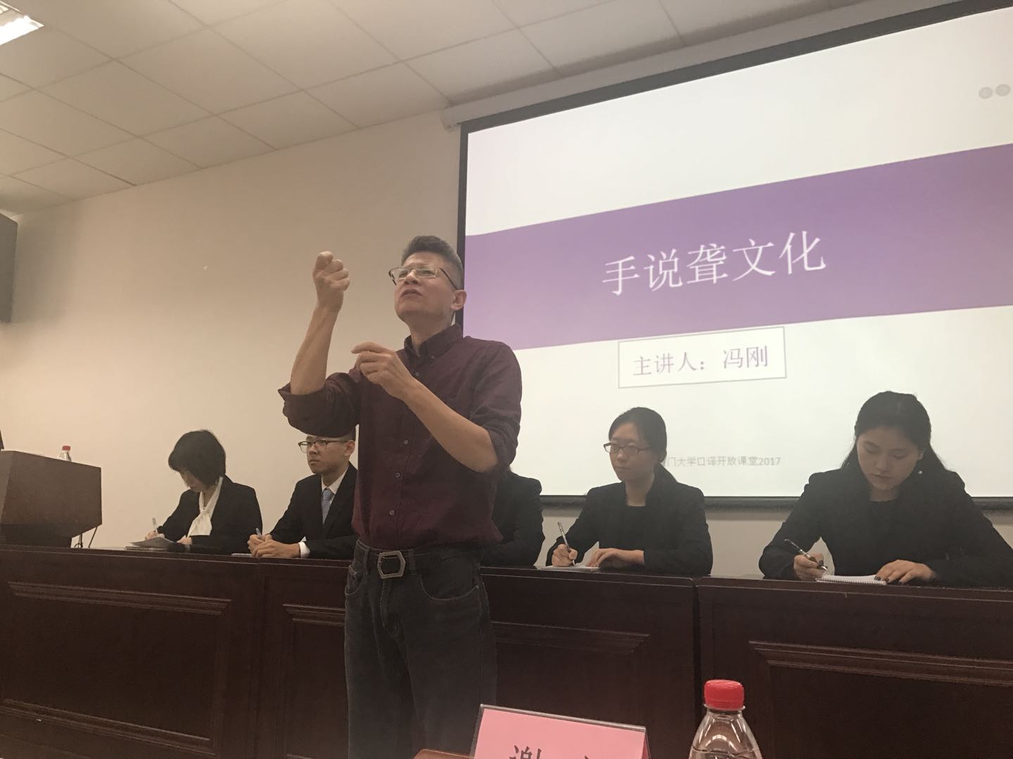 在两位发言人结束发言后,会议进入问答环节,肖老师邀请现场的听众即兴提问。对于很多来自各地的口译老师来说,这是他们第一次现场感受手语的魅力,加上冯刚老师惟妙惟肖、诙谐幽默的表演让很多嘉宾顿时对手语产生了浓烈的兴趣,他们非常踊跃地向冯刚老师提出了关于学习手语以及手语翻译的问题。