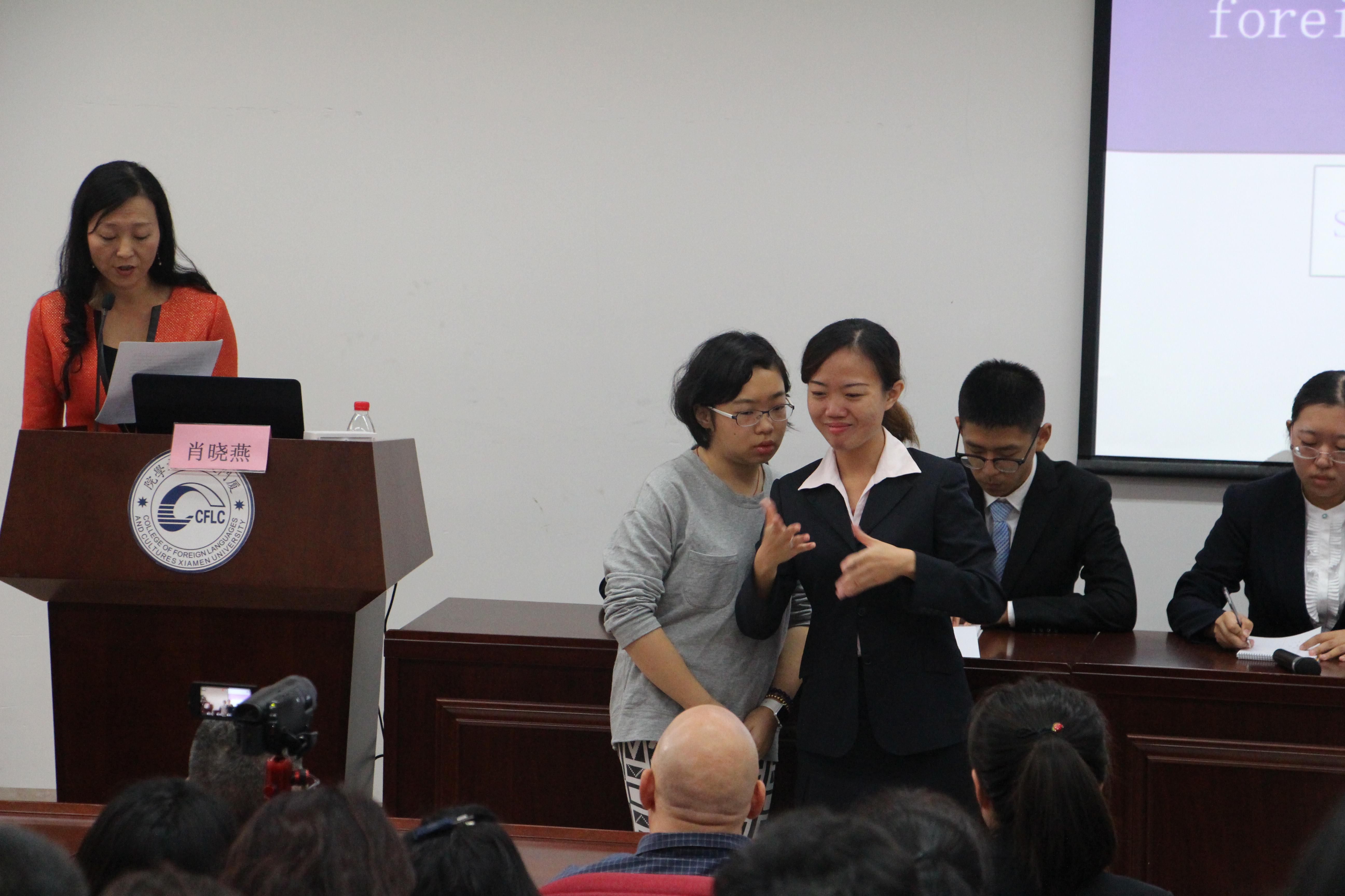 模拟会议口译的主讲老师是厦门大学口译团队的肖晓燕教授,她为此次模拟会议请来的发言嘉宾是来自美国的William Hildebrant先生以及来自北京的聋人艺术工作者冯刚先生。这门课最引人注目的地方是它所呈现出来的传译形式既有交传也有同传,是英汉交传、英汉耳语同传以及中国手语同传的完美结合和展现。担任英汉传译的是外文学院口译方向的研究生;担任中国手语到汉语传译的是特邀的两位手语译员:来自郑州工程学院的杨超然老师以及厦门特殊教育学校的林玲玲老师。