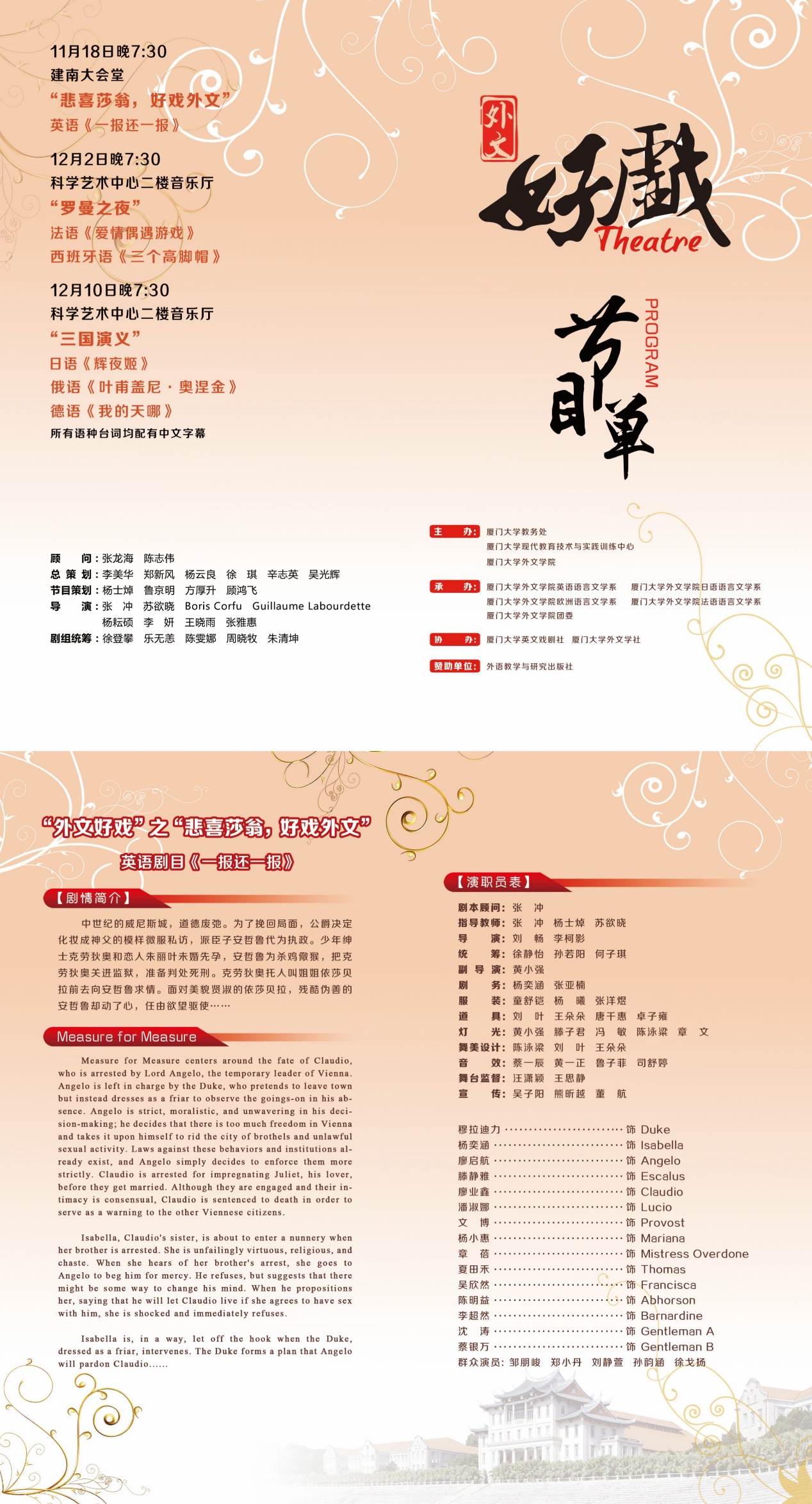 2016年,首届“外文好戏”在我校成功举办,为厦大校园营造出表演外文戏剧、观赏外文戏剧的良好学习氛围。2016年年底,“外文好戏”英语剧组借纪念莎士比亚逝世四百周年的莎剧研究与演出热潮,选定莎士比亚经典戏剧《一报还一报》作为2017年“外文好戏”英语戏剧专场演出的剧目。