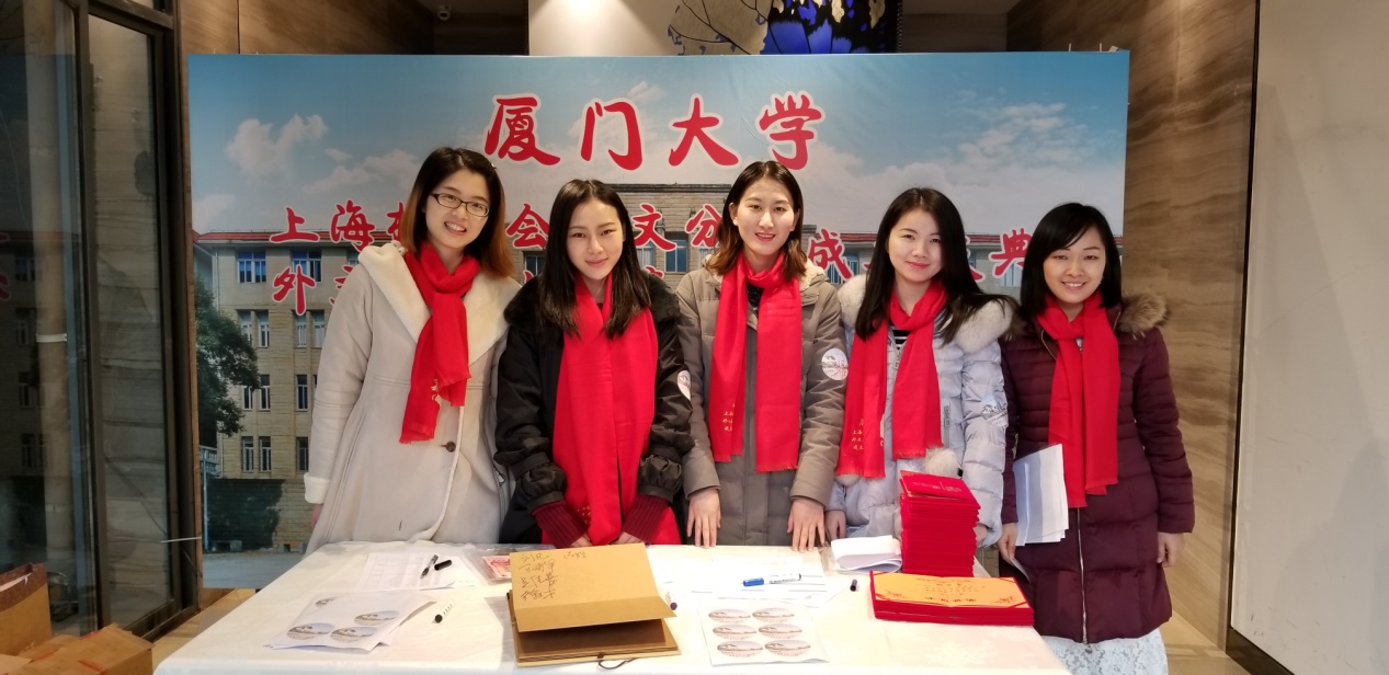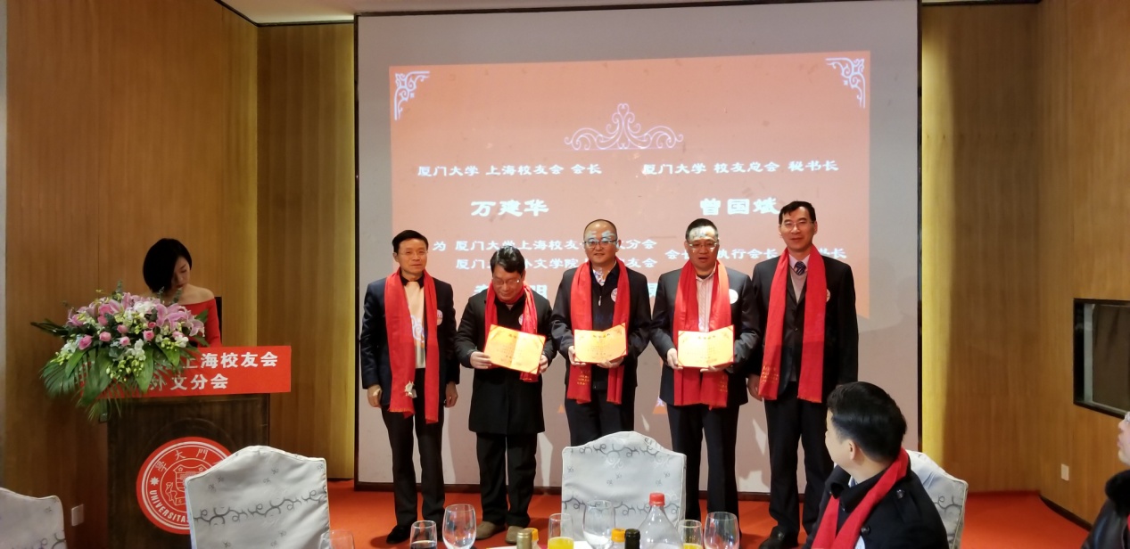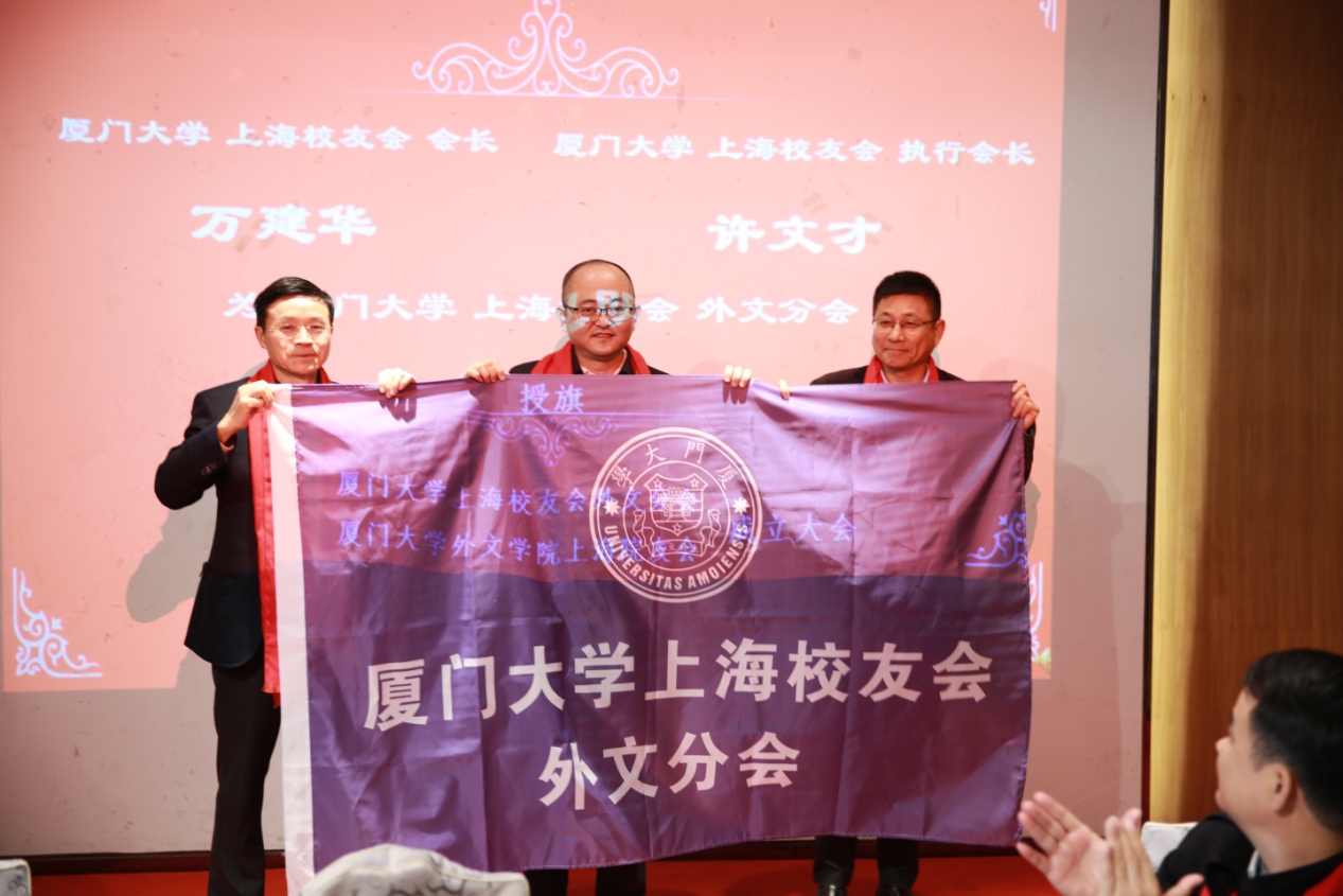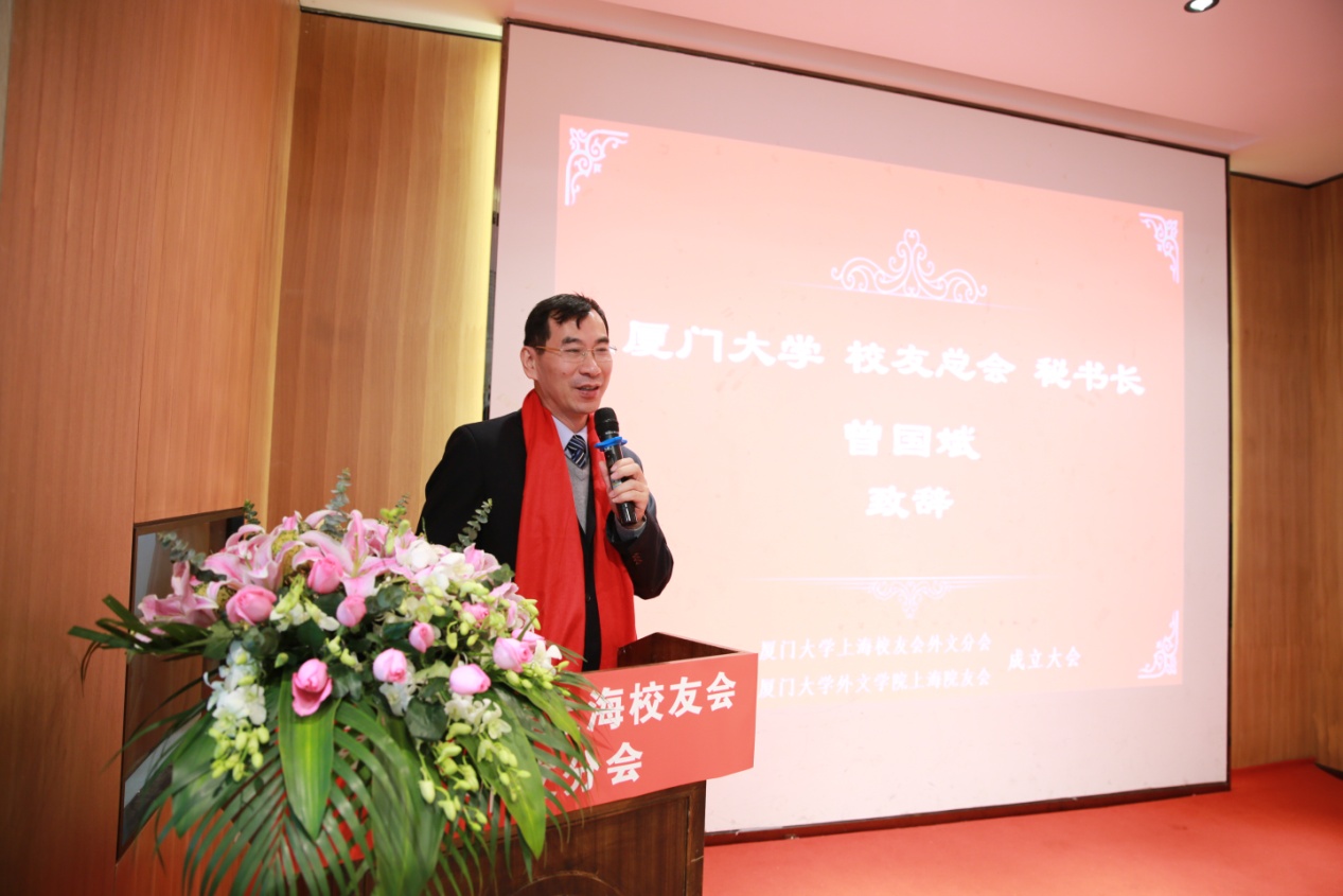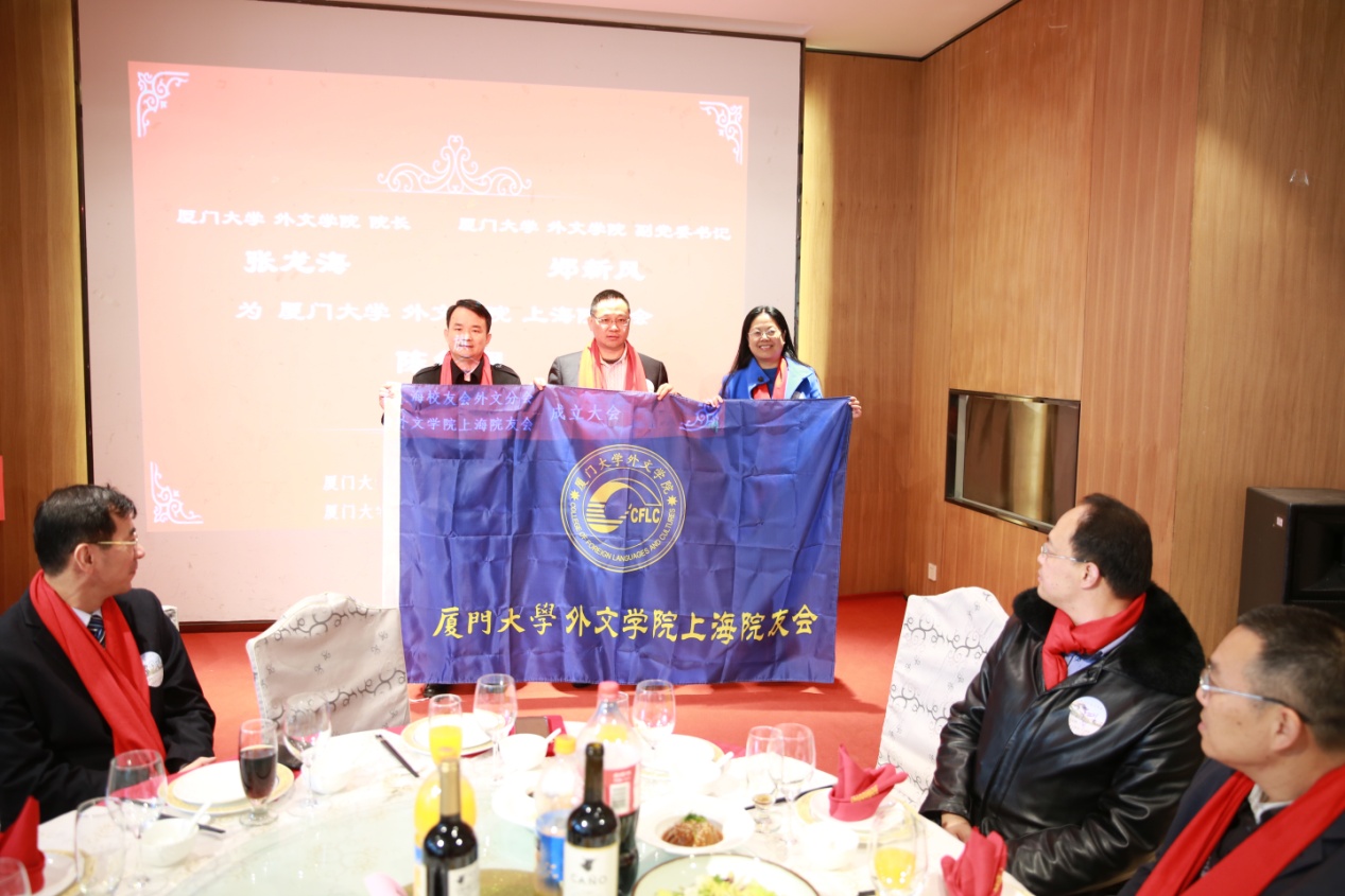1月6日上午,厦门大学上海校友会外文分会暨厦门大学外文学院上海院友会成立大会隆重举行。厦门大学校友总会秘书长曾国斌,外文学院院长张龙海、党委副书记郑新风、副院长吴光辉、英语系主任杨士焯、欧语系教授顾鸿飞、厦门大学校友总会联络部主任张闻博,厦门大学上海校友会理事长万建华、执行会长徐文才、副理事长朱德贞、秘书长何苏湘,以及厦门大学外文学院杭州院友会筹备负责人朱锦绣、厦门大学深圳校友会理事长暨外文分会会长孙小荔、厦门校友会副会长暨外文分会会长周志文、北京校友会副会长暨外文分会会长李江、浙江暨杭州院友会筹备组负责人朱群、重庆校友会荣誉会长冯多俊、福州校友会代表胡旻、贵州校友会会长赵浣淳、内蒙古校友会会长于树军及厦门大学上海校友会兄弟分会校友代表等领导嘉宾出席了本次成立大会。