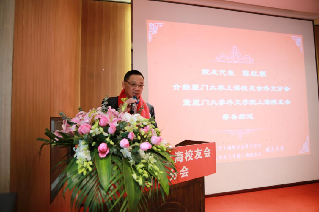 厦门大学上海校友会外文分会暨厦门大学外文学院上海院友会筹备组代表陈红根介绍筹备经过。本次筹备工作在厦门大学校友总会、厦门大学上海校友会、厦门大学外文学院的高度重视、悉心指导下,在广大在沪校友、院友的积极参与中完成。陈红根表示,筹备期间,母院领导高度重视,曾前往上海就成立外文分会相关工作作出部署,多次听取意见、指导工作,建立院友信息库,有条不紊地推进了各项筹备工作。